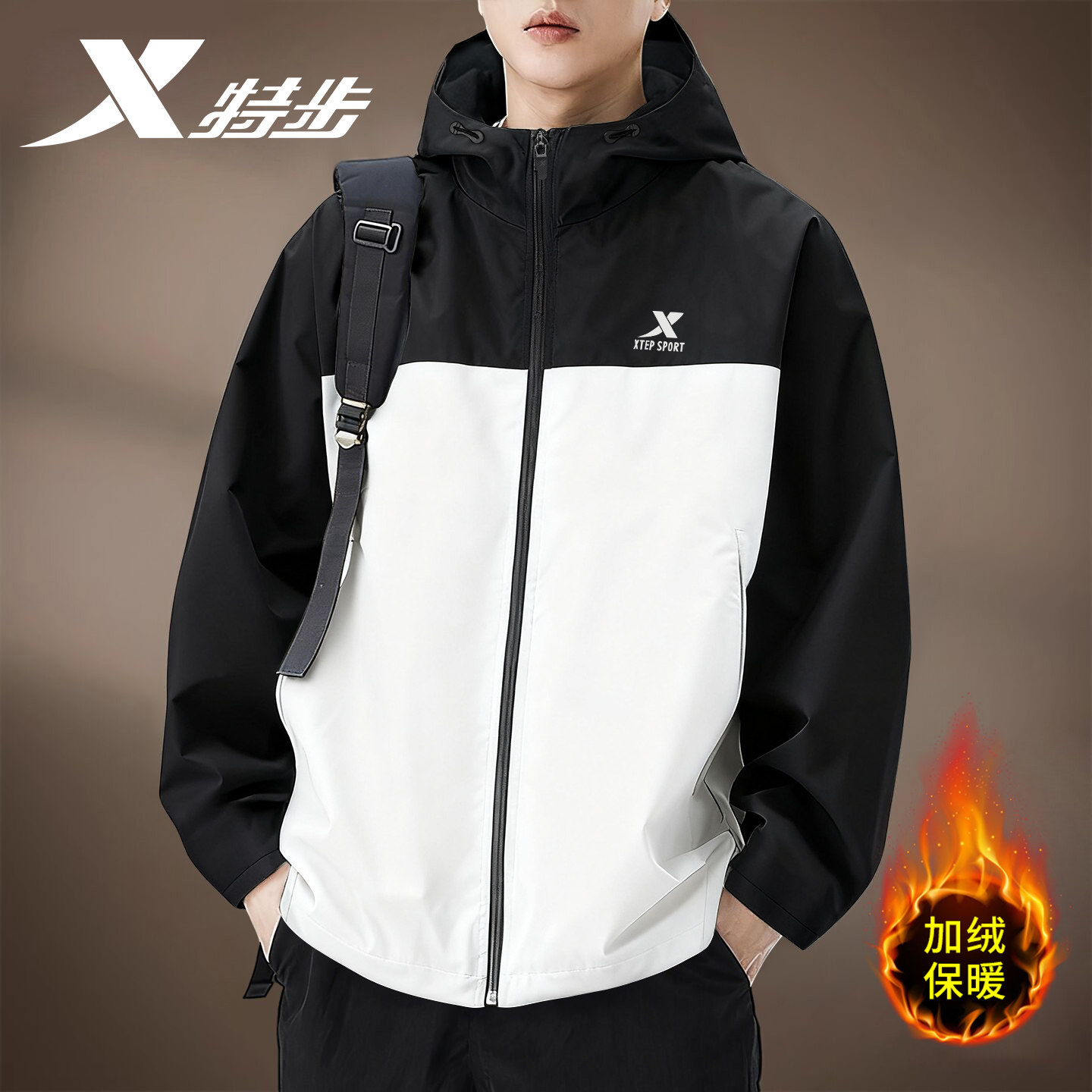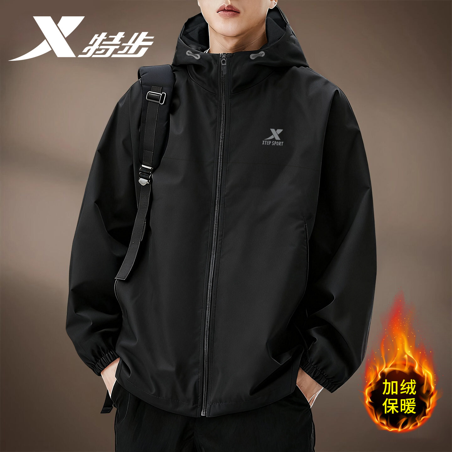 特步加绒运动外套男黑色官方旗舰店正品2026新款冬季休闲保暖风衣