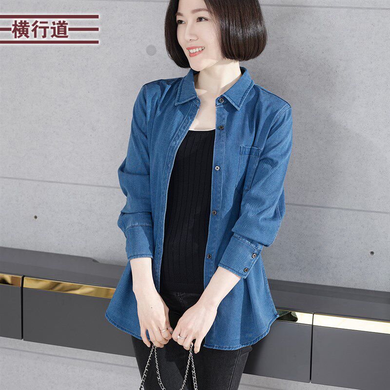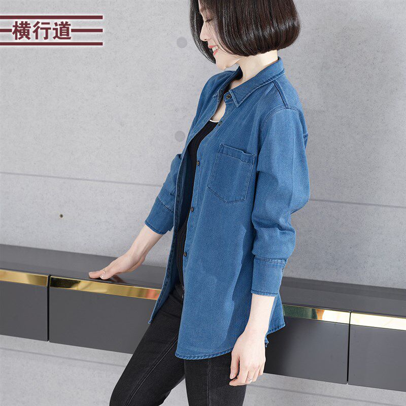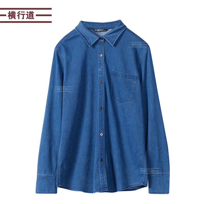 牛仔衬衣长袖衬衫领纯色宽松扣子2025春季新款休闲口袋大码小外套