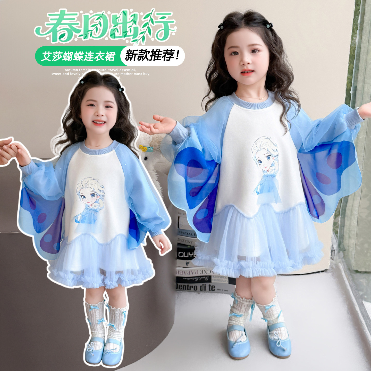 女孩春装长袖纱纱裙爱莎公主裙子女童翅膀裙春季演出礼服连衣裙