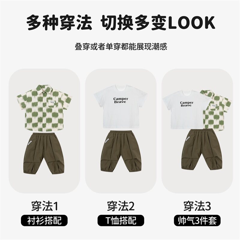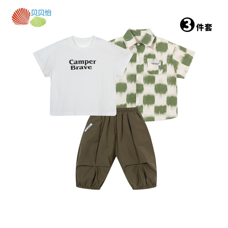 贝贝怡男童纯棉短袖套装夏季2024新款衬衫儿童长裤t恤三件套夏装