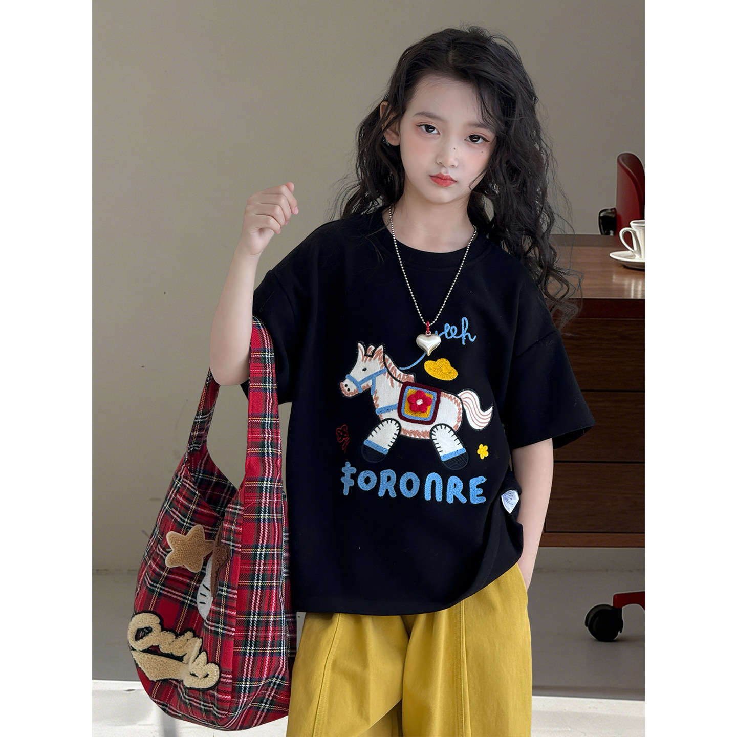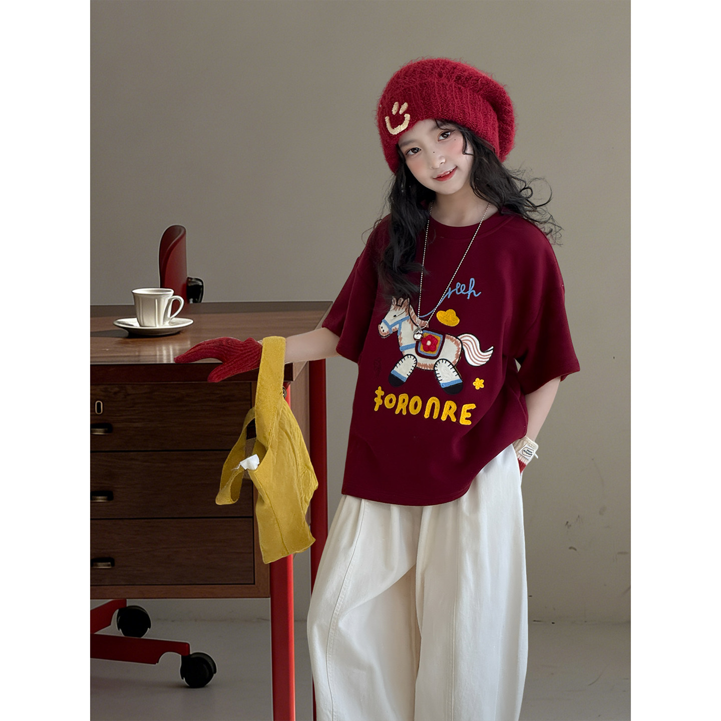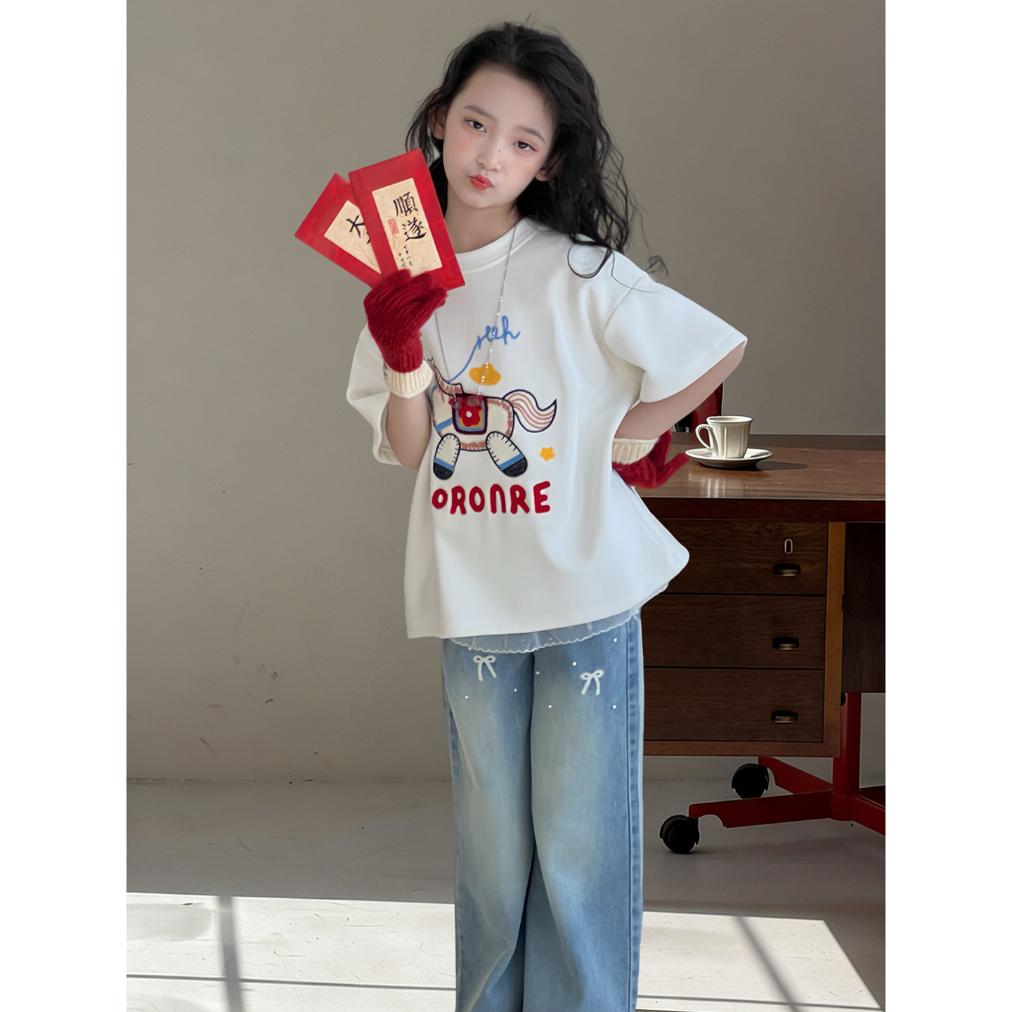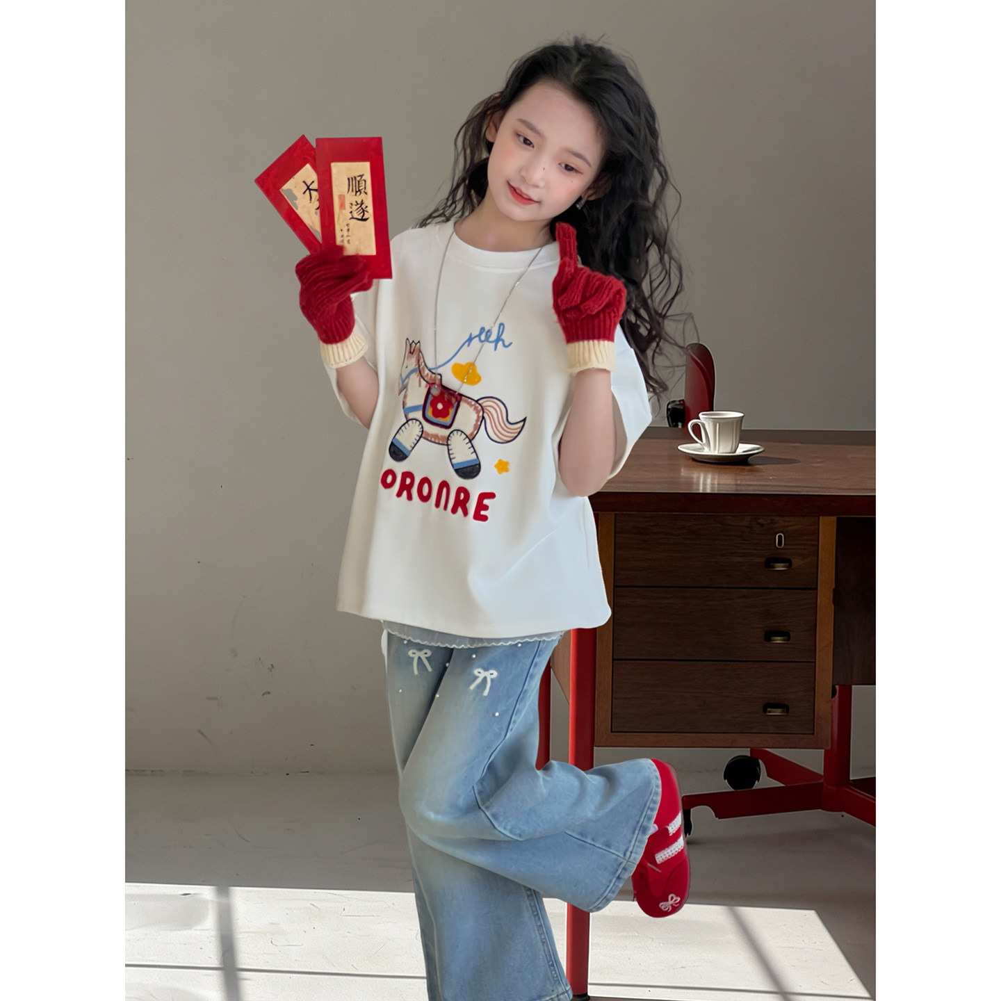 女童短袖T恤2026年春装新款儿童加厚内搭上衣女孩加厚暖绒拜年服