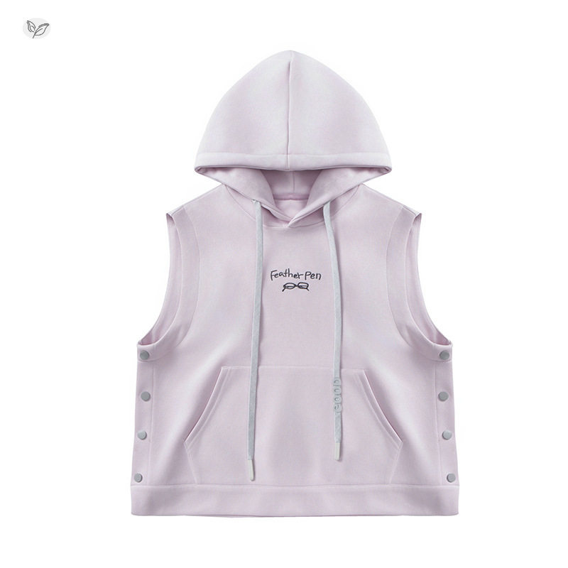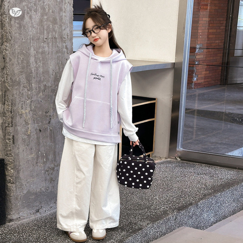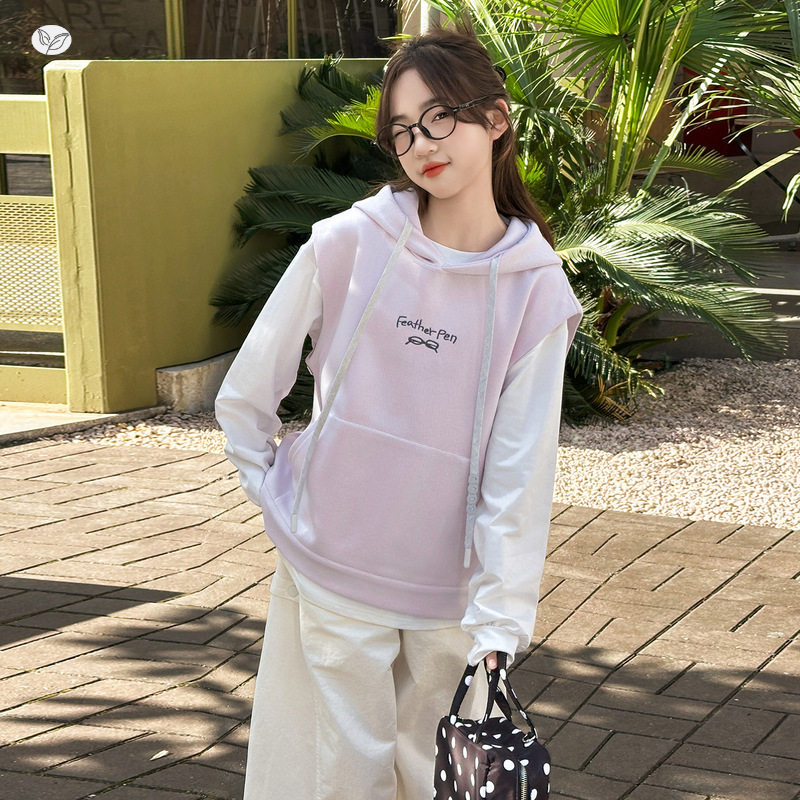 女童粉紫色卫衣马甲春秋2026新款纽扣连帽背心中大童印花长袖T恤