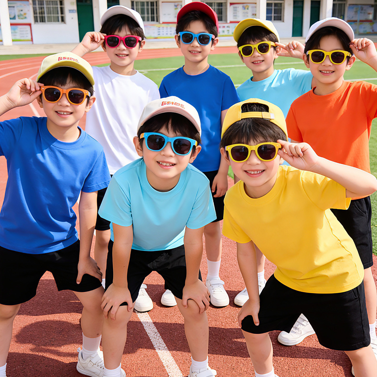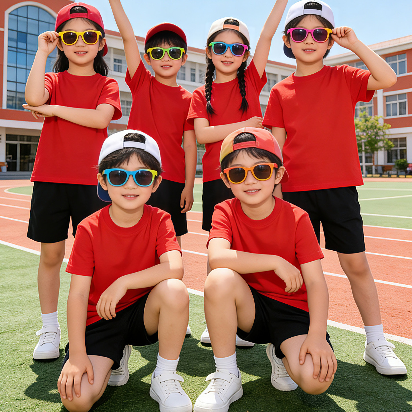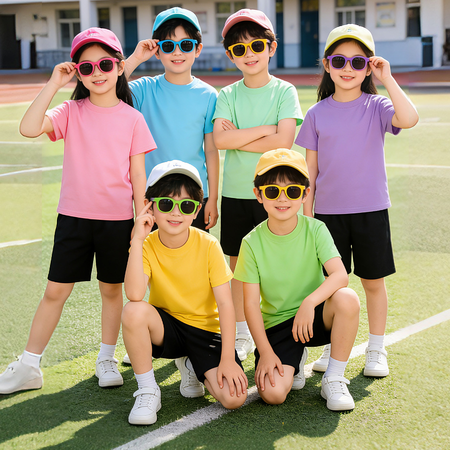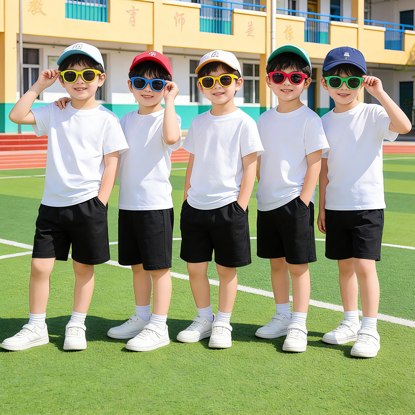 儿童白色t恤短袖黑色短裤运动套装 男童女童多巴胺彩色演出服纯棉