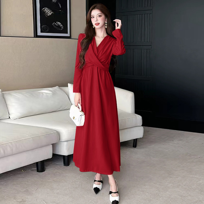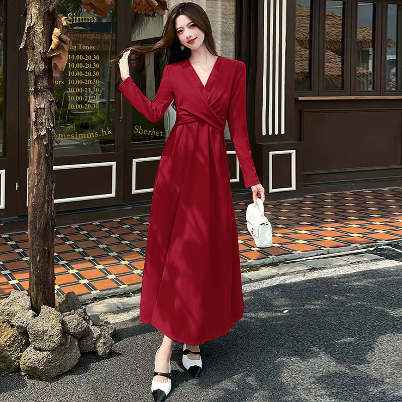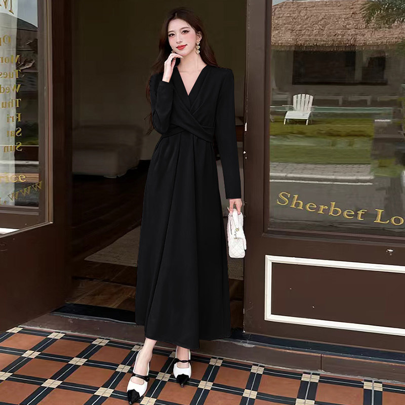 秋冬新款轻奢高级感大摆裙长袖修身显瘦V领轻熟风长裙时尚连衣裙