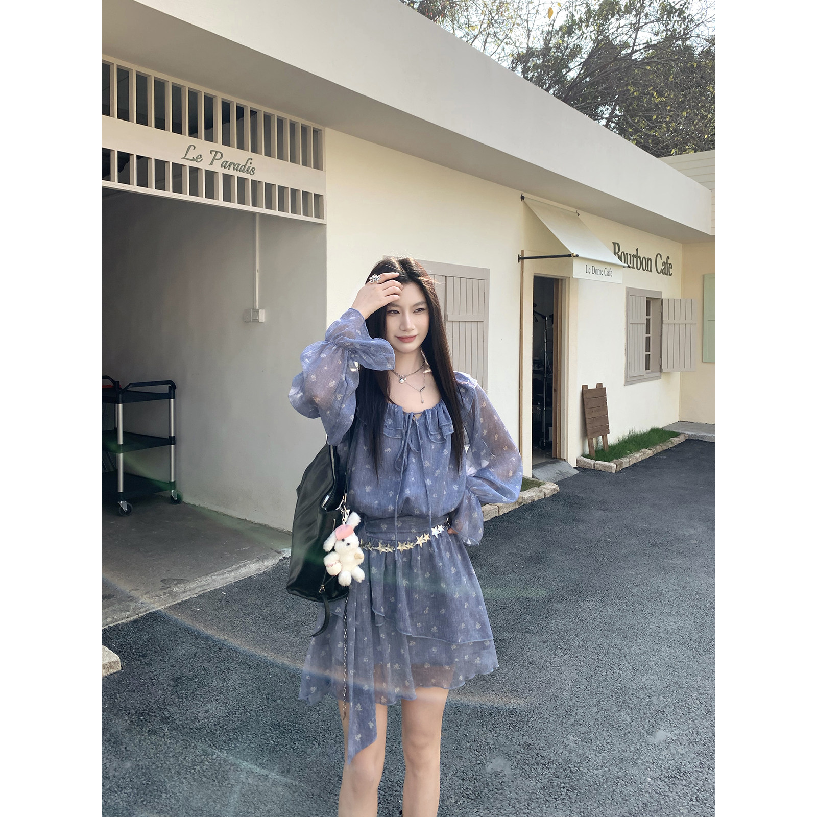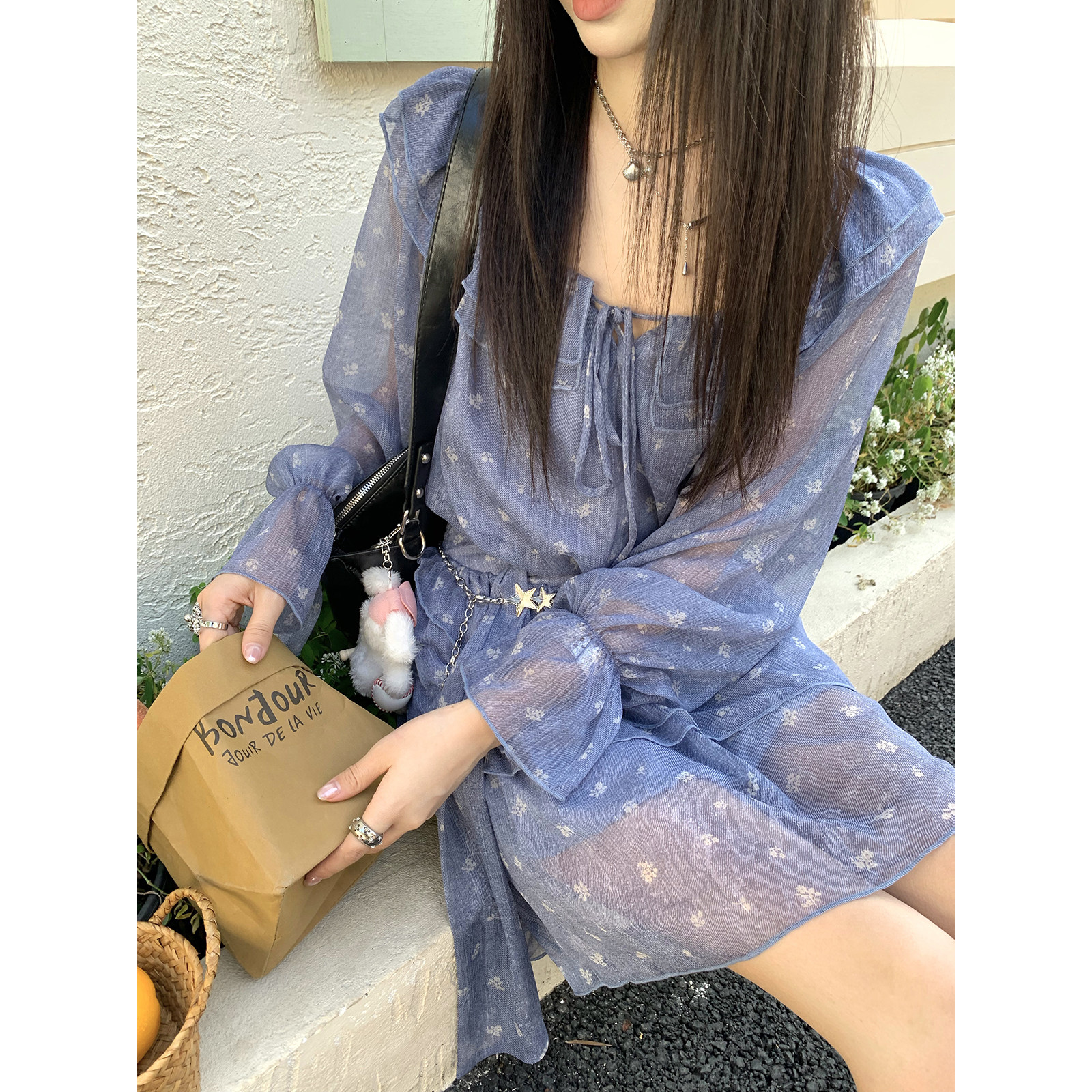 Joeyoo新款蓝色荷叶边碎花连衣裙女夏设计感多穿长袖系带收腰短裙