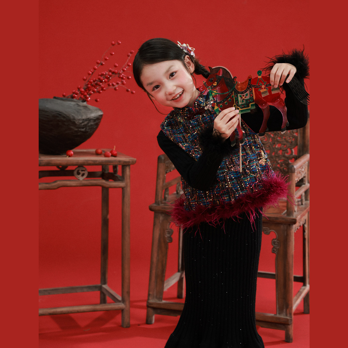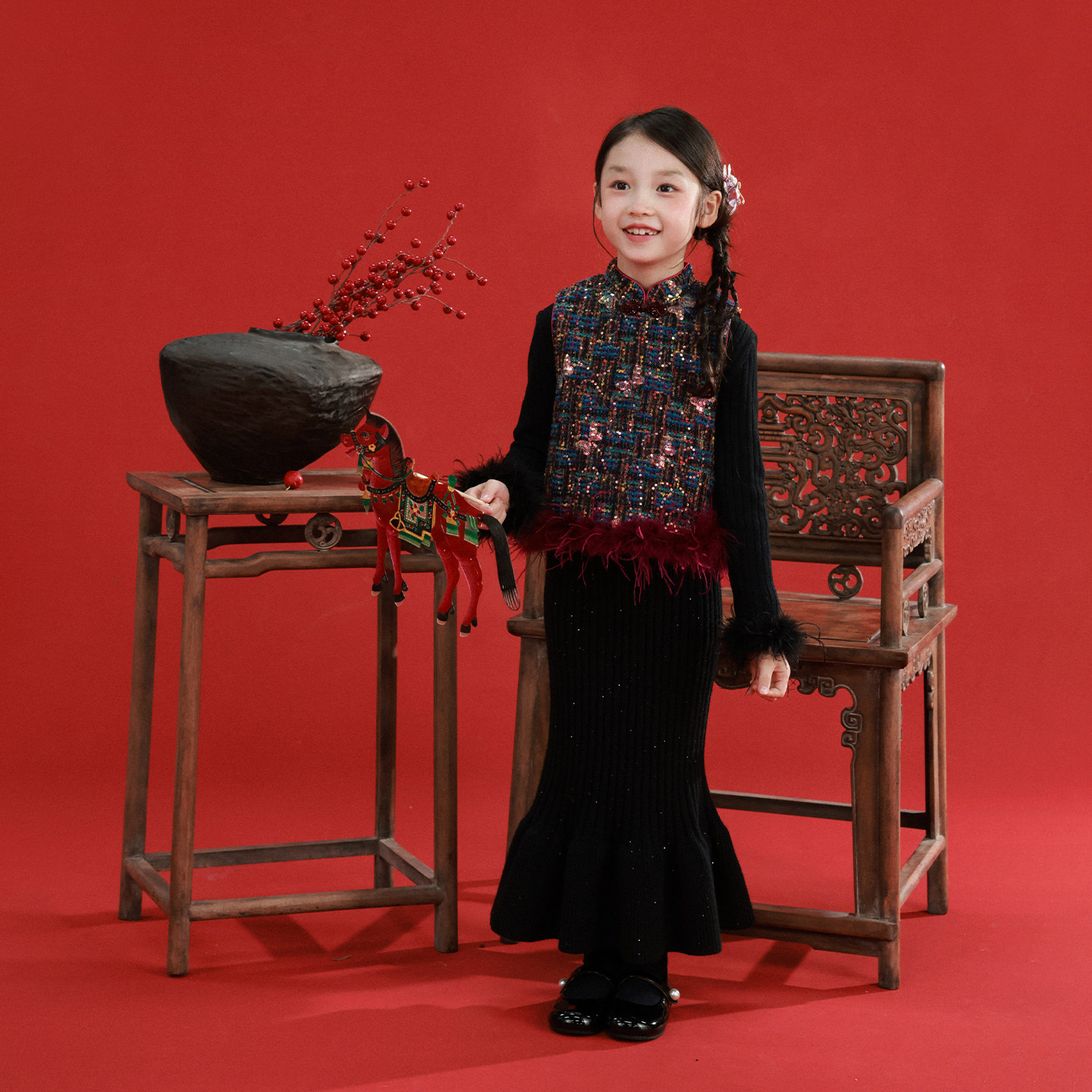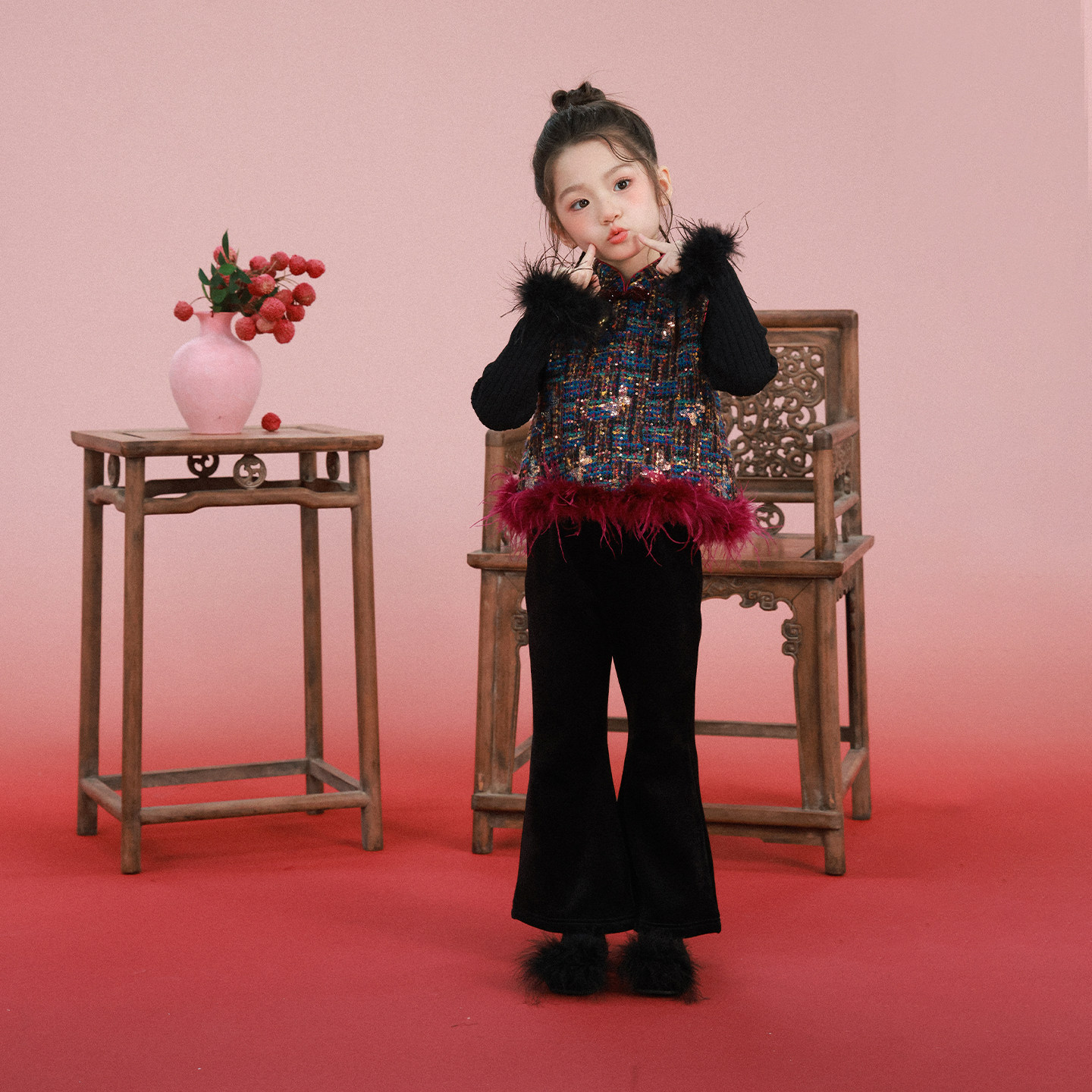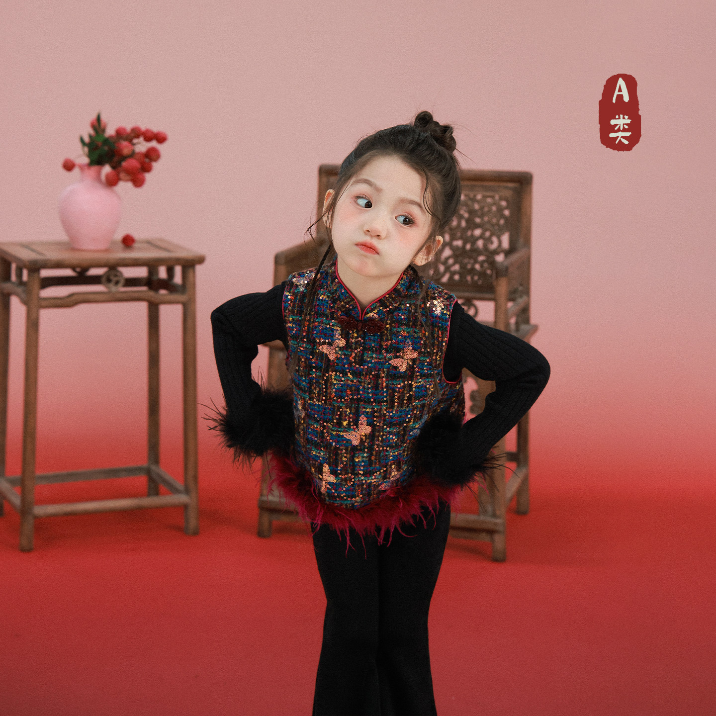 大耳象女童亮片蝴蝶旗袍马甲冬款宝儿新中式拜年服动物毛条上衣