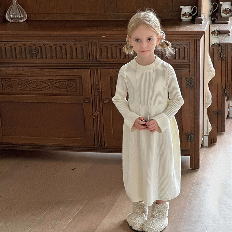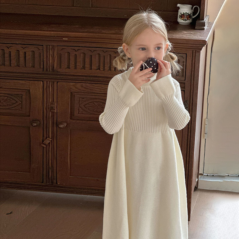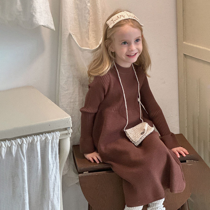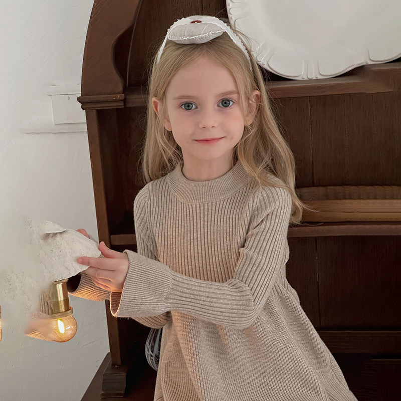 秋冬女童甜美荷叶边毛衣裙儿童女宝宝纯色毛线连衣裙内搭针织裙潮