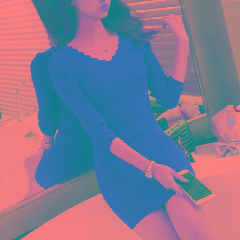 针织打底连衣裙紧身百搭长袖短款修身包臀裙v领粉色毛衣女春秋季
