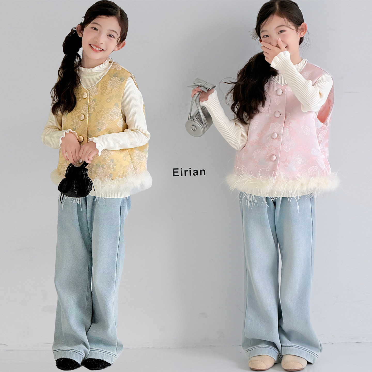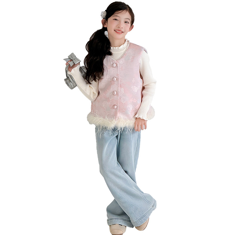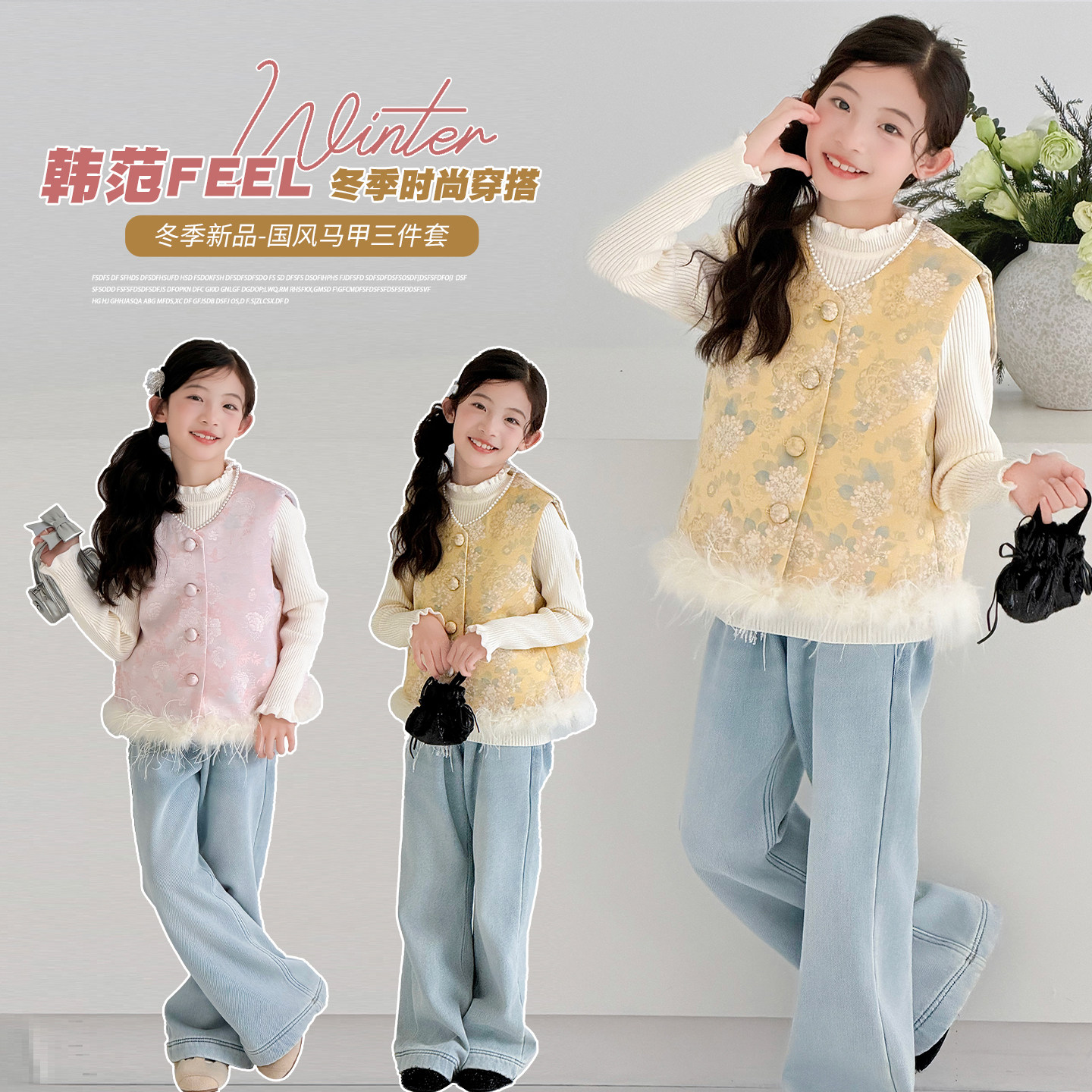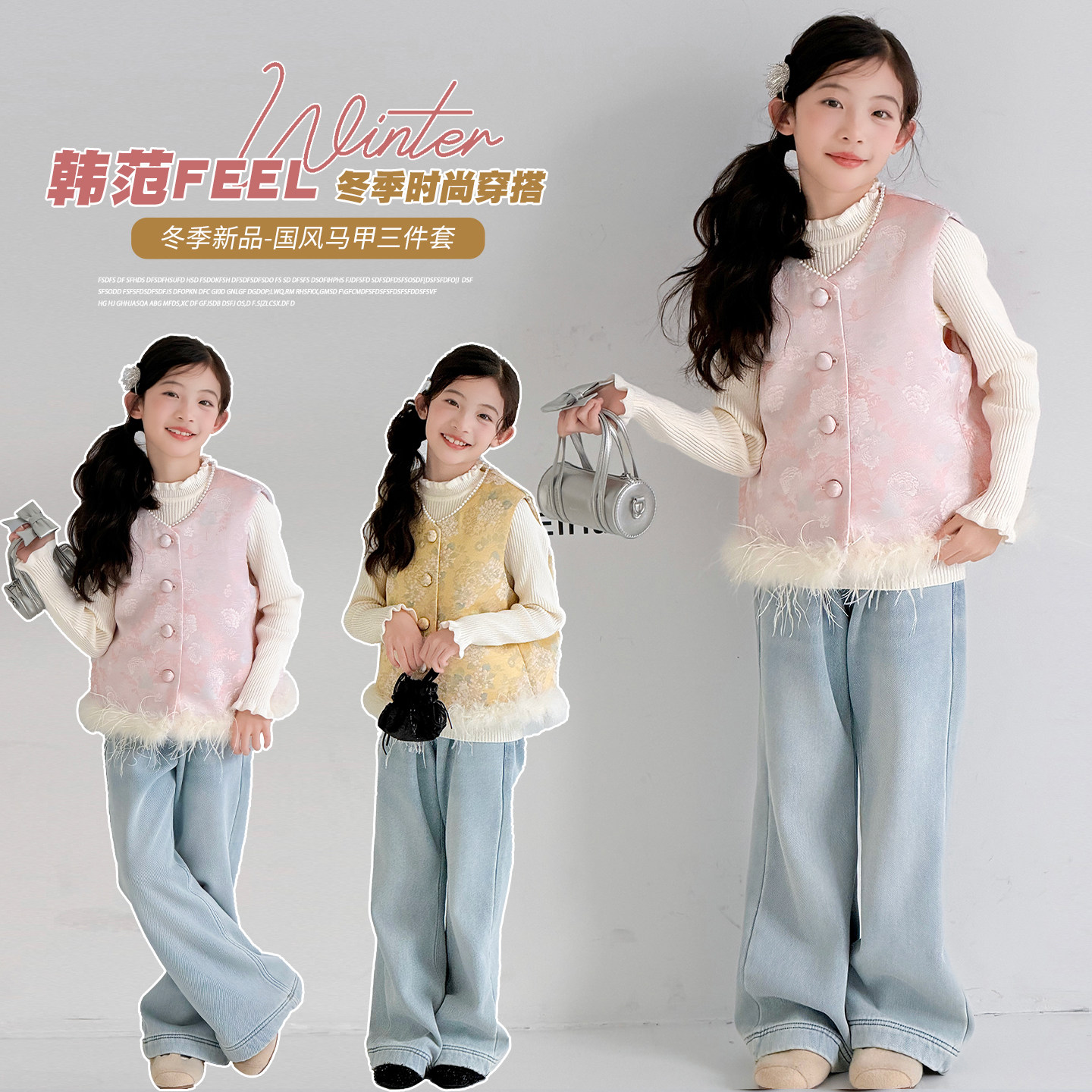 女童新年套装2026年新款秋冬装时髦中大童韩版马甲打底裤子三件套