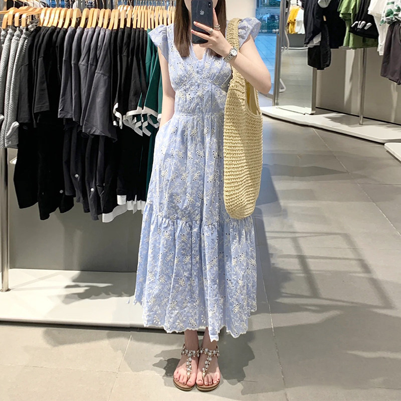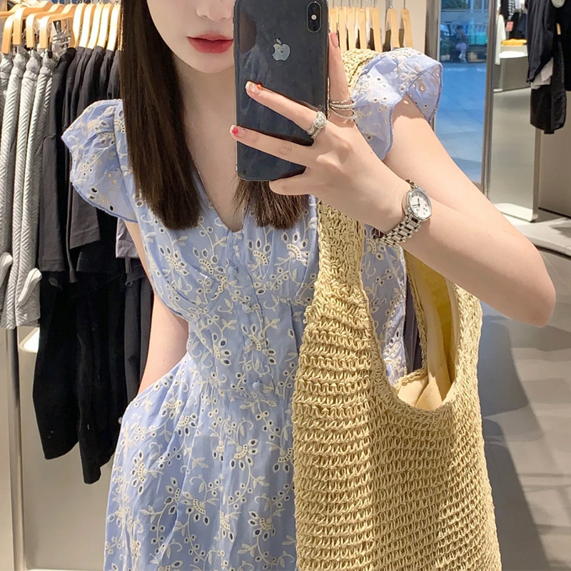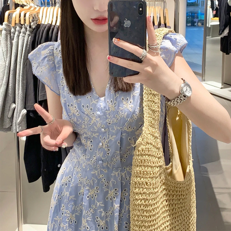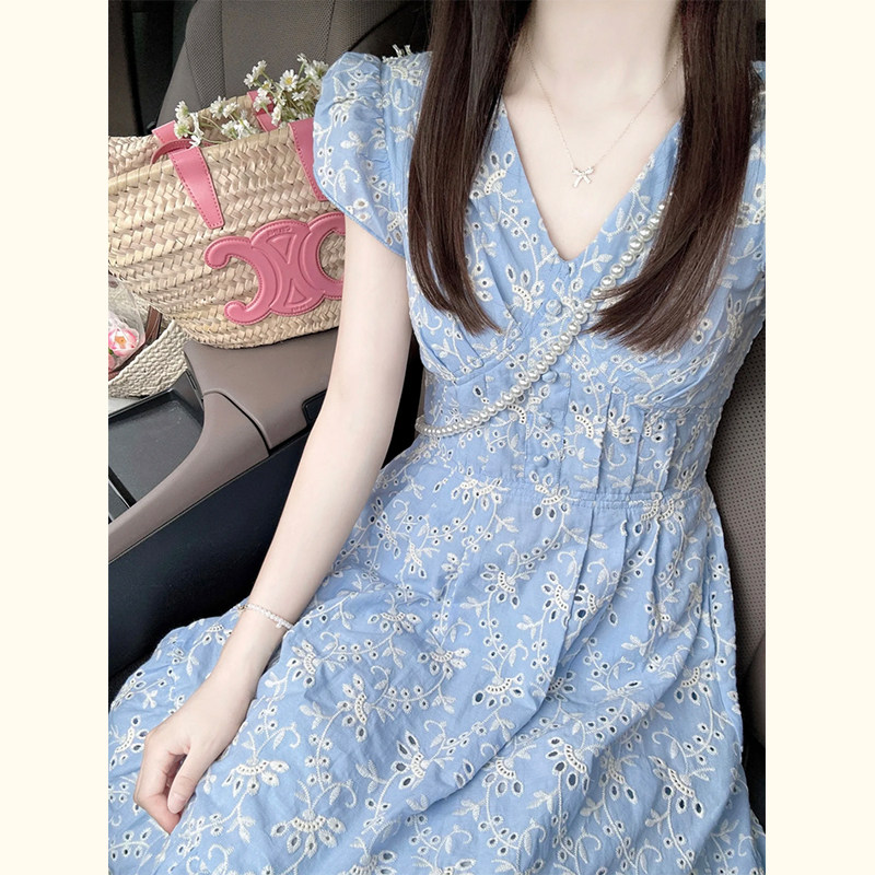 高级感重工刺绣蓝色桔梗法式连衣裙女夏季新款小个子收腰显瘦裙子