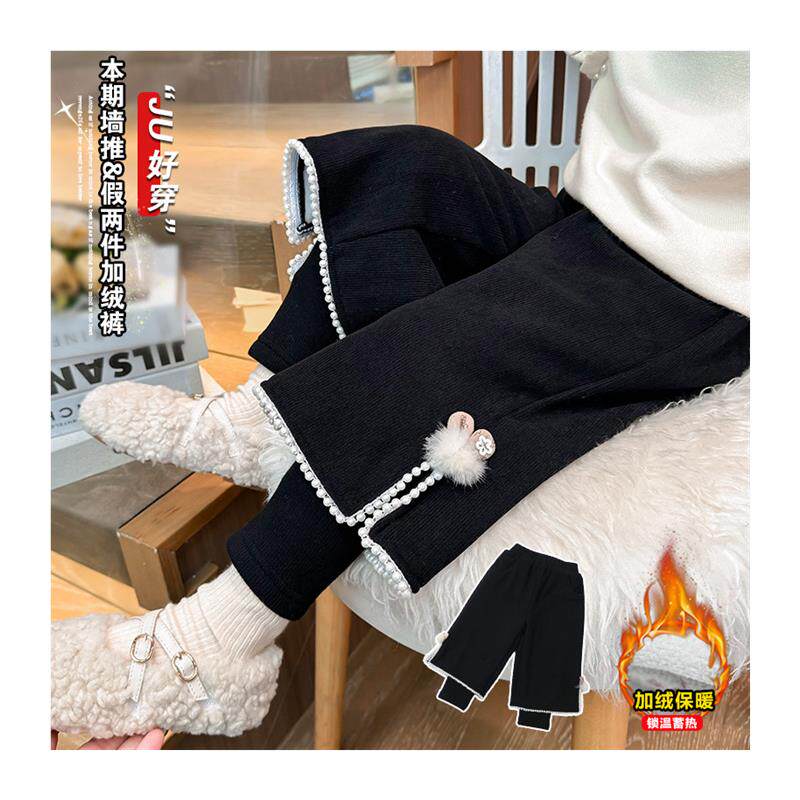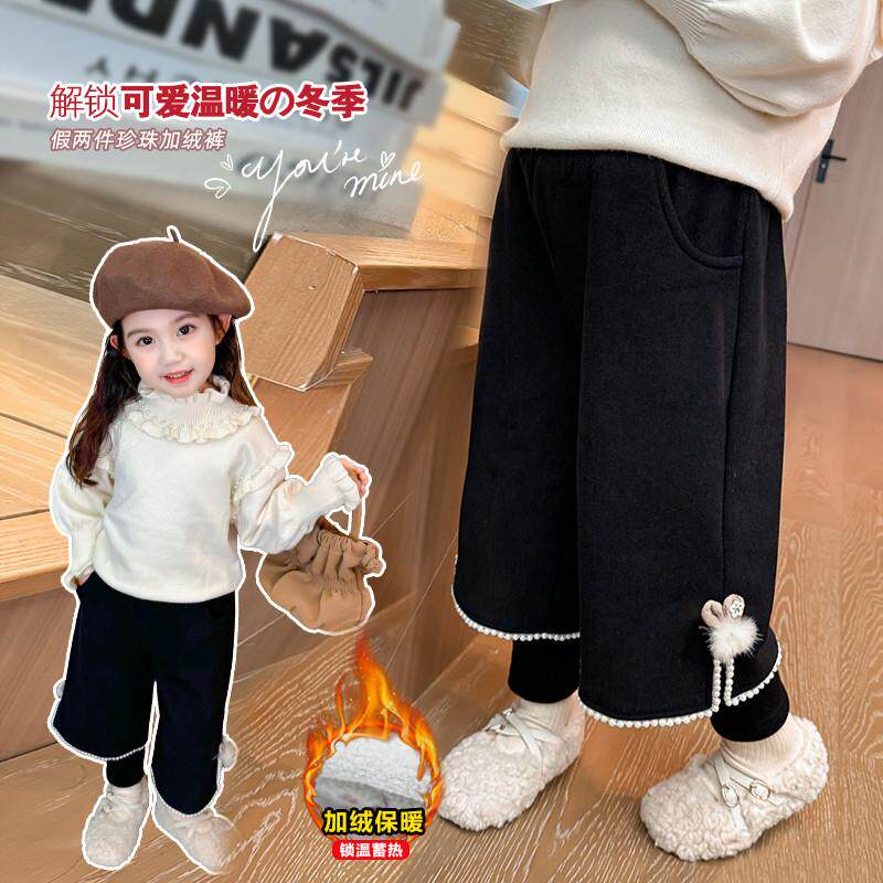 女童加绒裤子秋冬款2024新款儿童洋气冬季一体薄绒卫裤宝宝阔腿裤