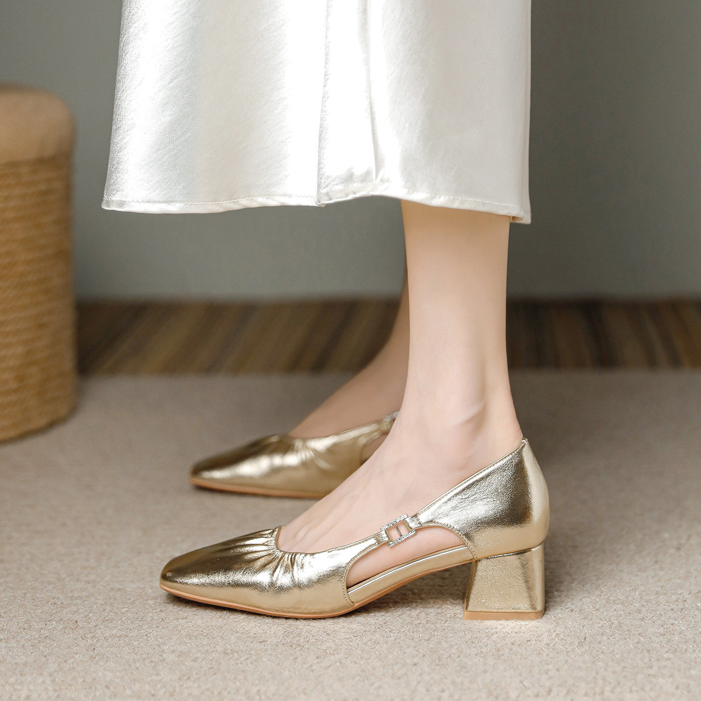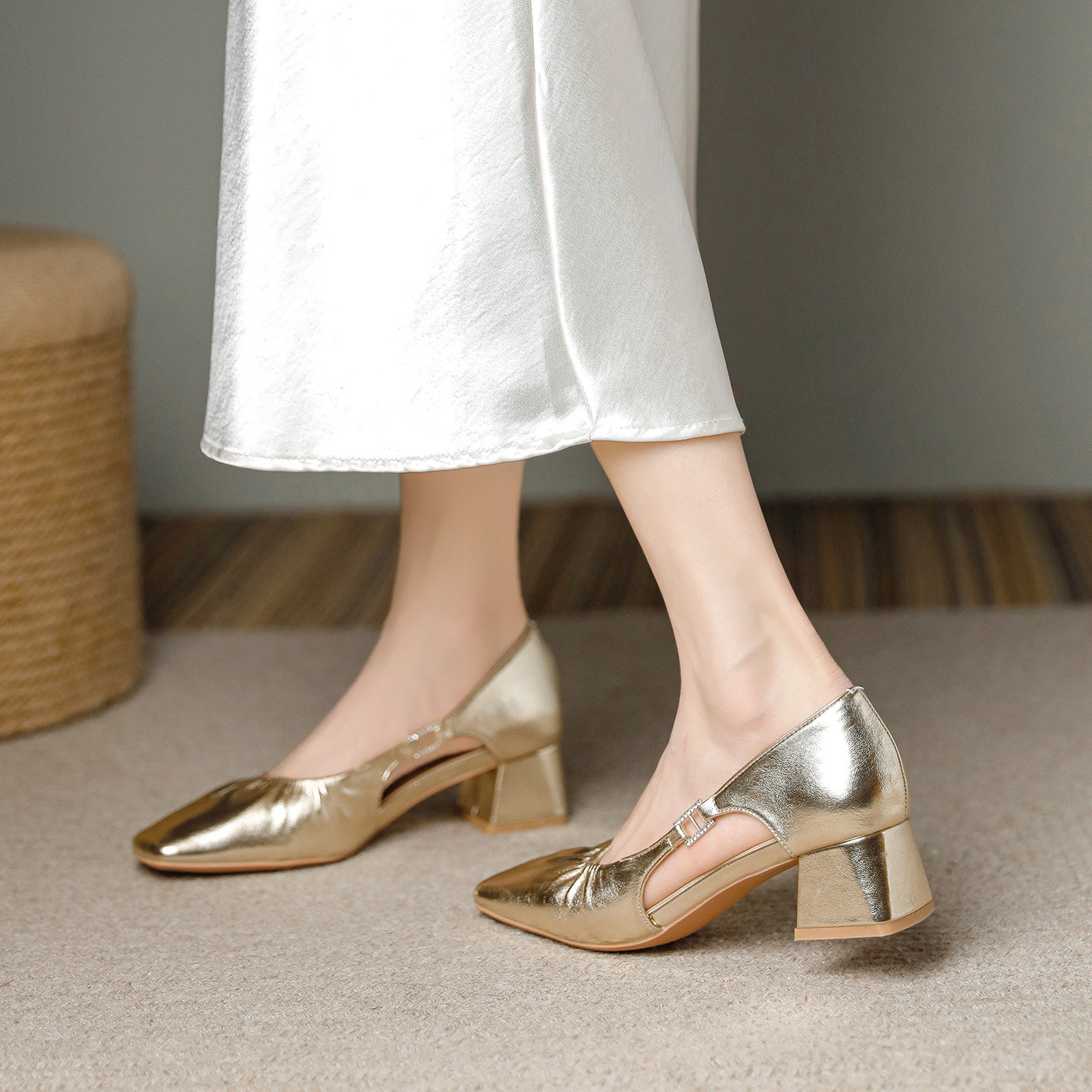 金色名媛高级感镂空粗跟方头玛丽珍单鞋女高跟2025春夏新款配裙子