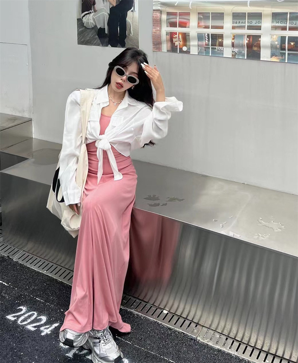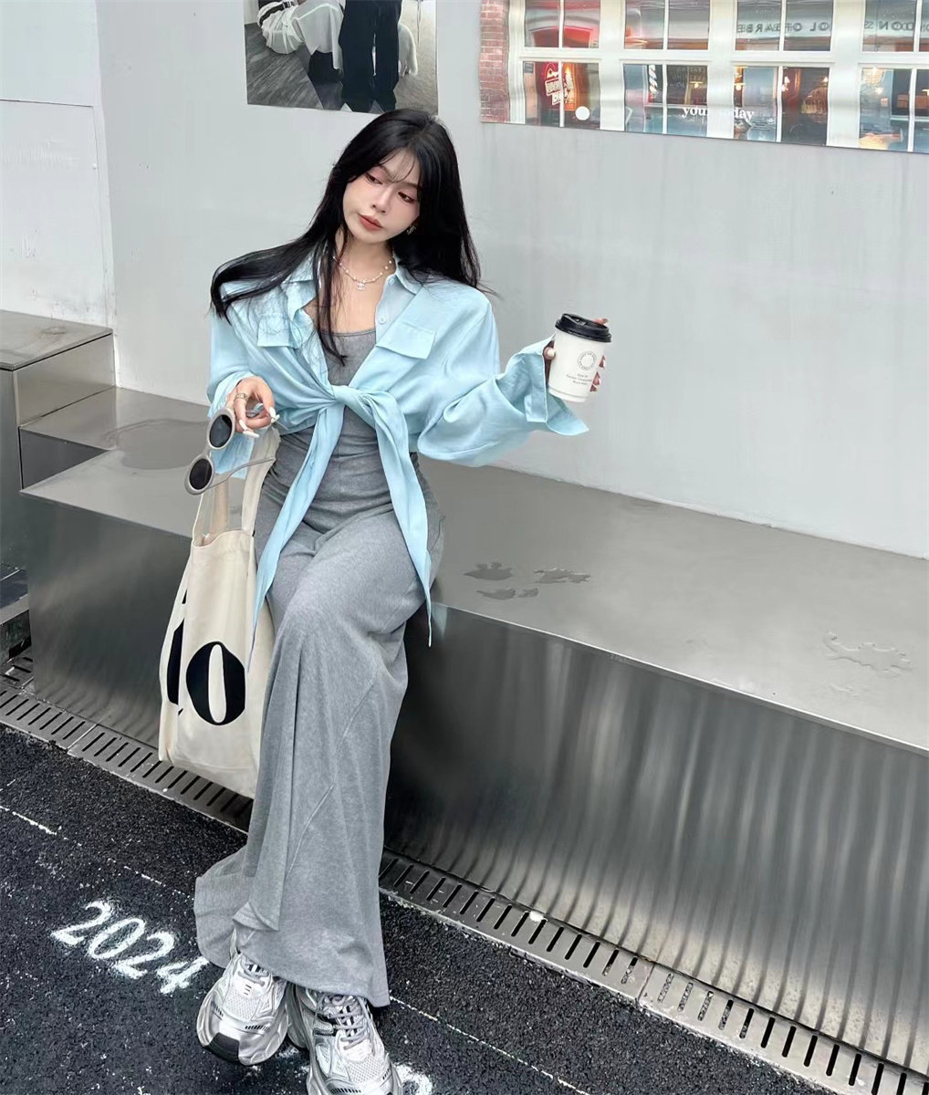 特价韩国收腰中长款A字垂感连衣裙 性感吊带裙短款防晒衫外搭套装