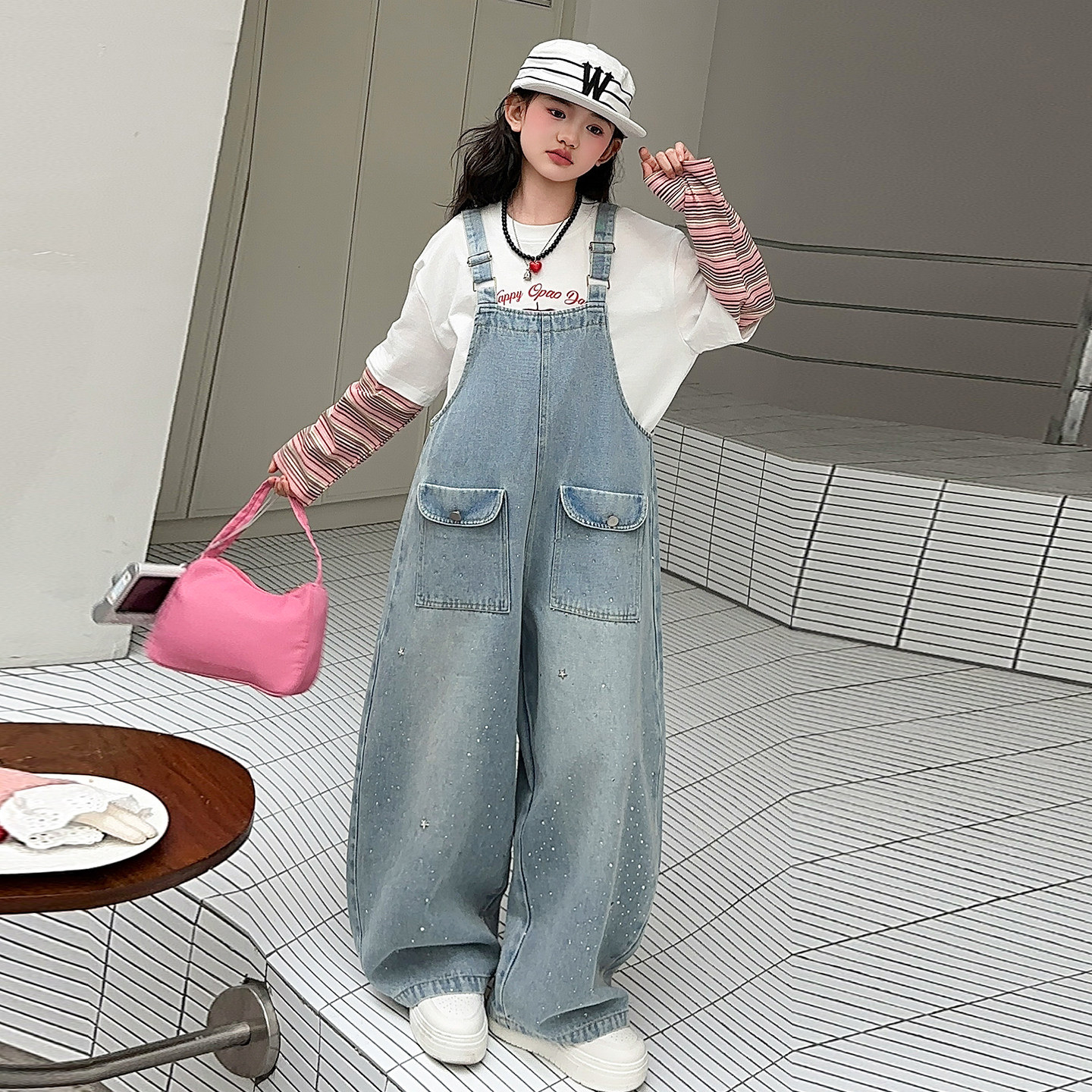 女童牛仔背带裤套装春秋装2026新款儿童洋气中大童韩版宽松吊带裤