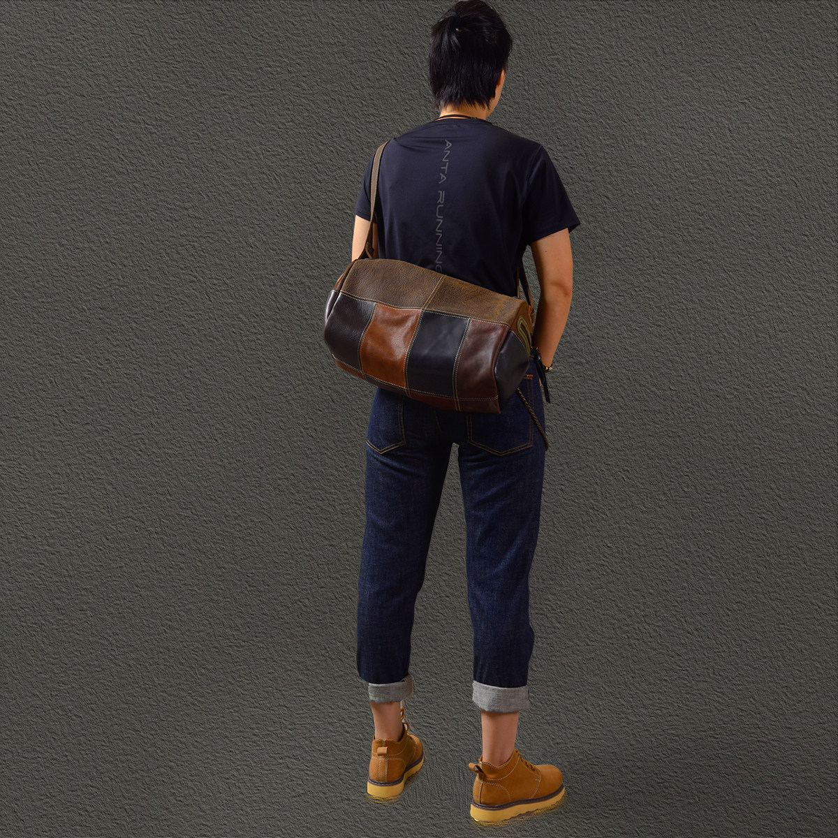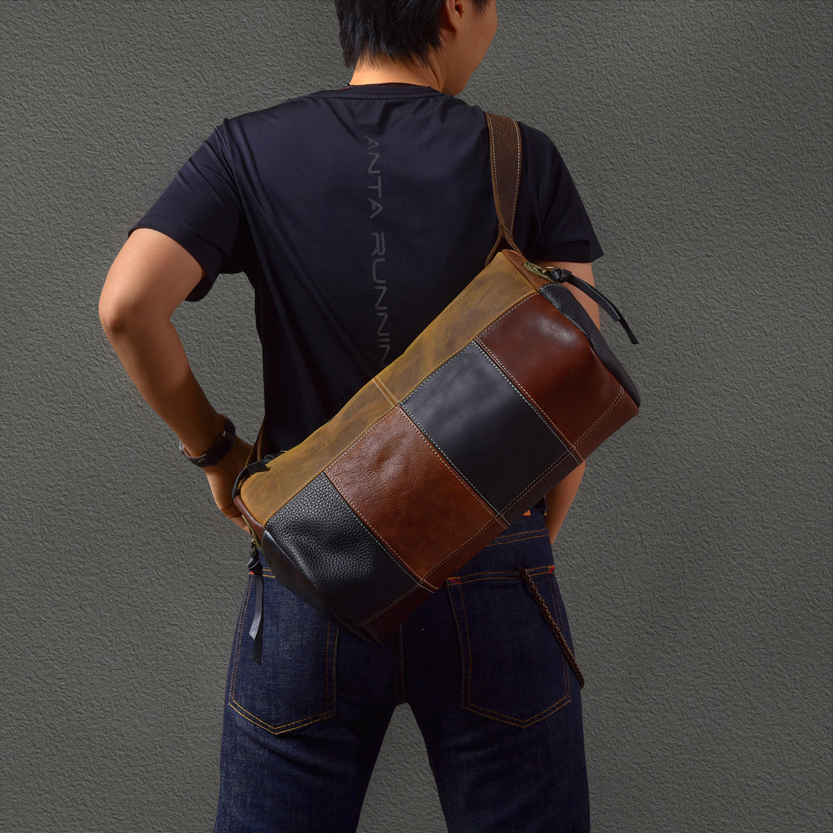 二十四街复古拼接头层牛皮撞色水桶包真皮运动包男款真皮斜挎背包