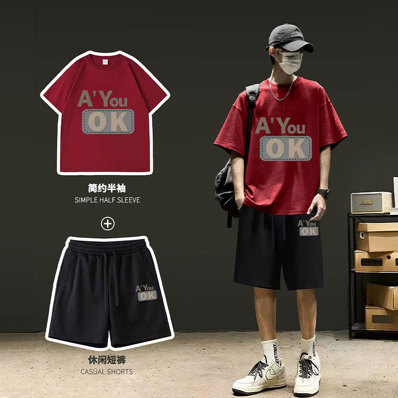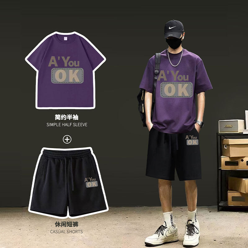 潮流纯棉套装短袖t恤男夏季加肥加大码学生青少年帅气夏装两件装