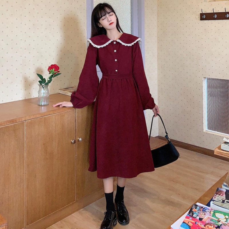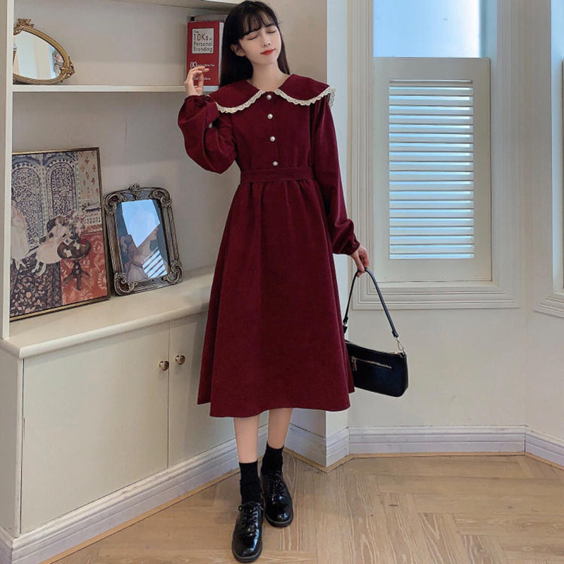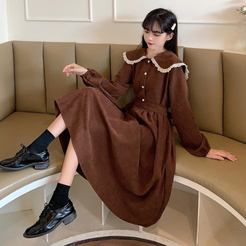 灯芯绒长袖连衣裙子少女春秋装2021新款初中高中学生学院风娃娃领