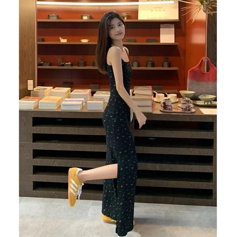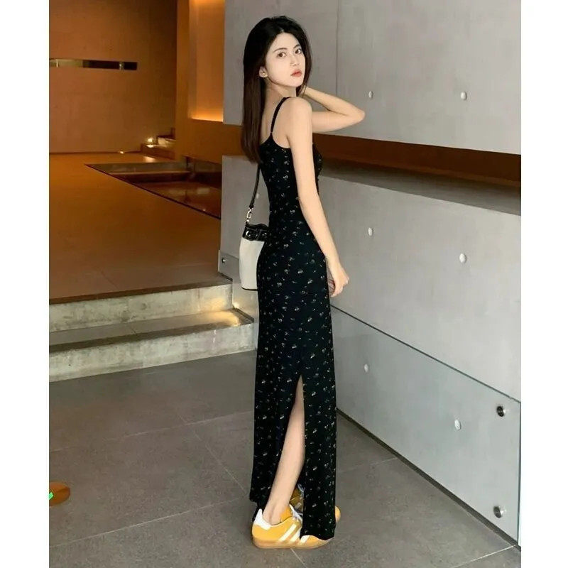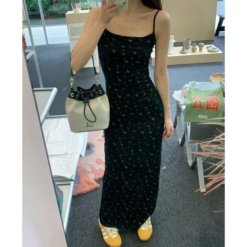 法式温柔碎花连衣裙女春夏气质修身显瘦女神范黑色长款包臀吊带裙