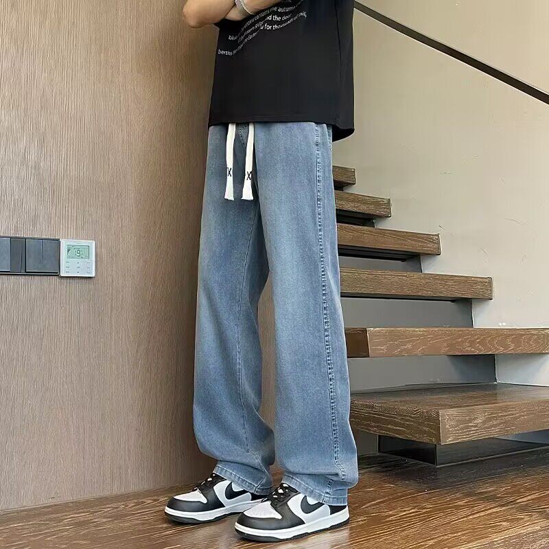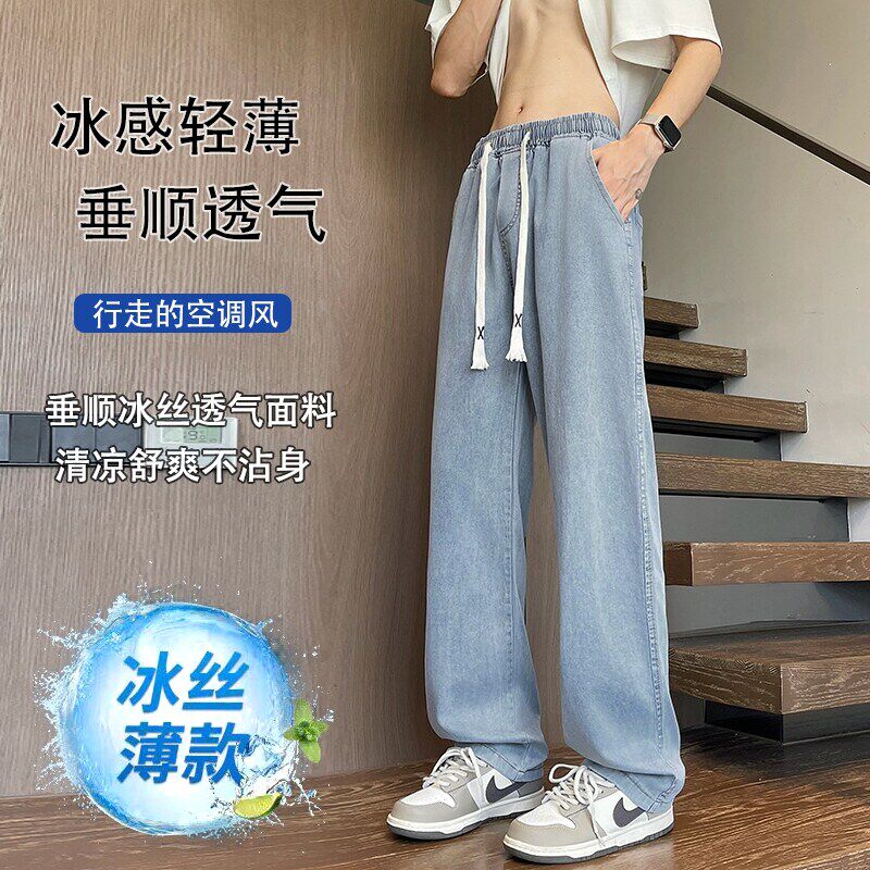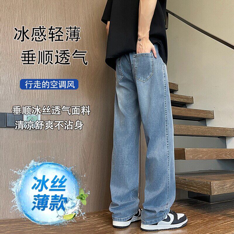 2026新款青少年冰丝牛仔裤男夏季薄款宽松直筒阔腿裤垂感休闲裤子