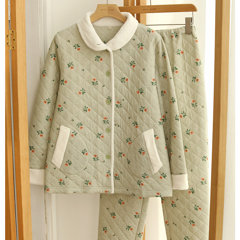 冬季保暖女士纯棉睡衣空气棉加厚三层夹棉秋冬长袖家居服套装加绒