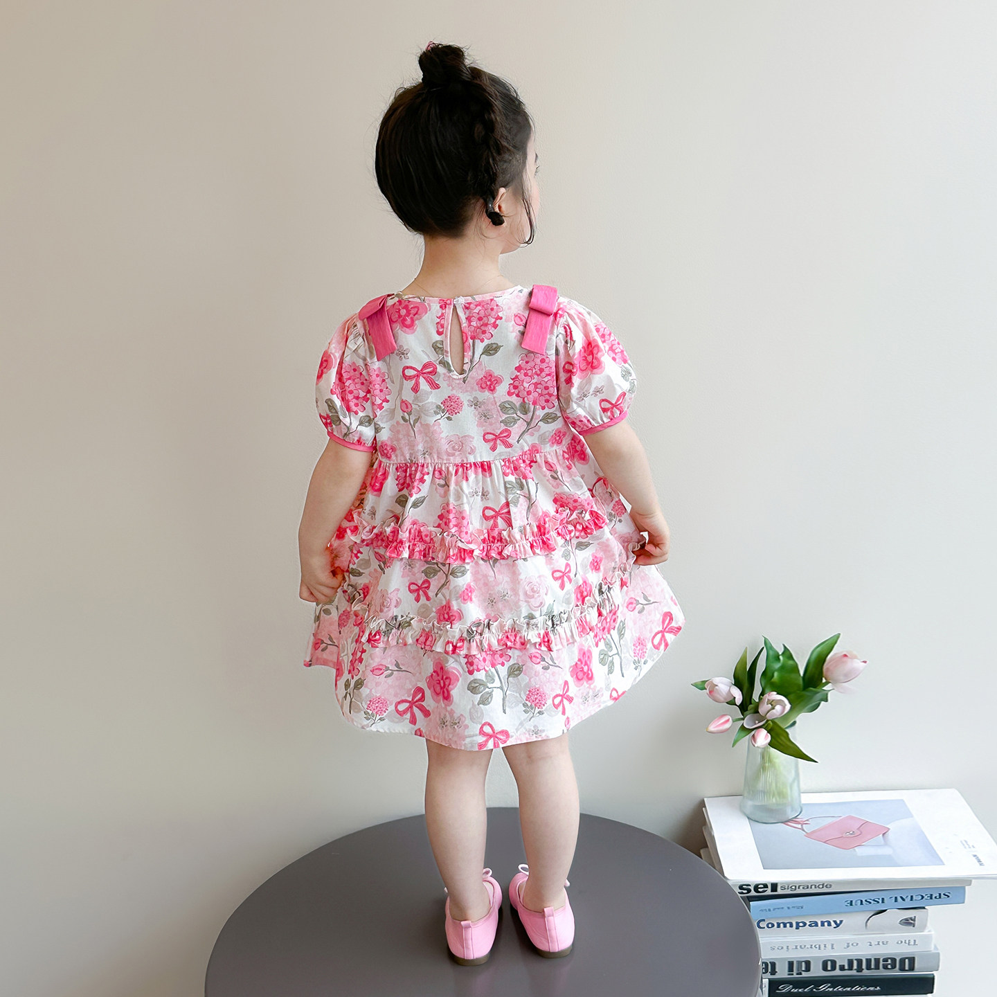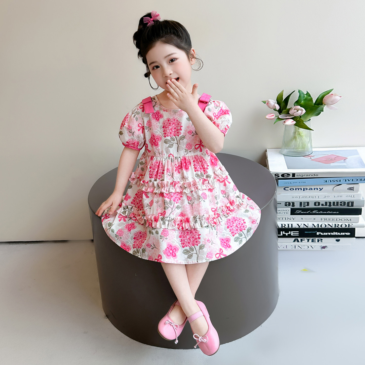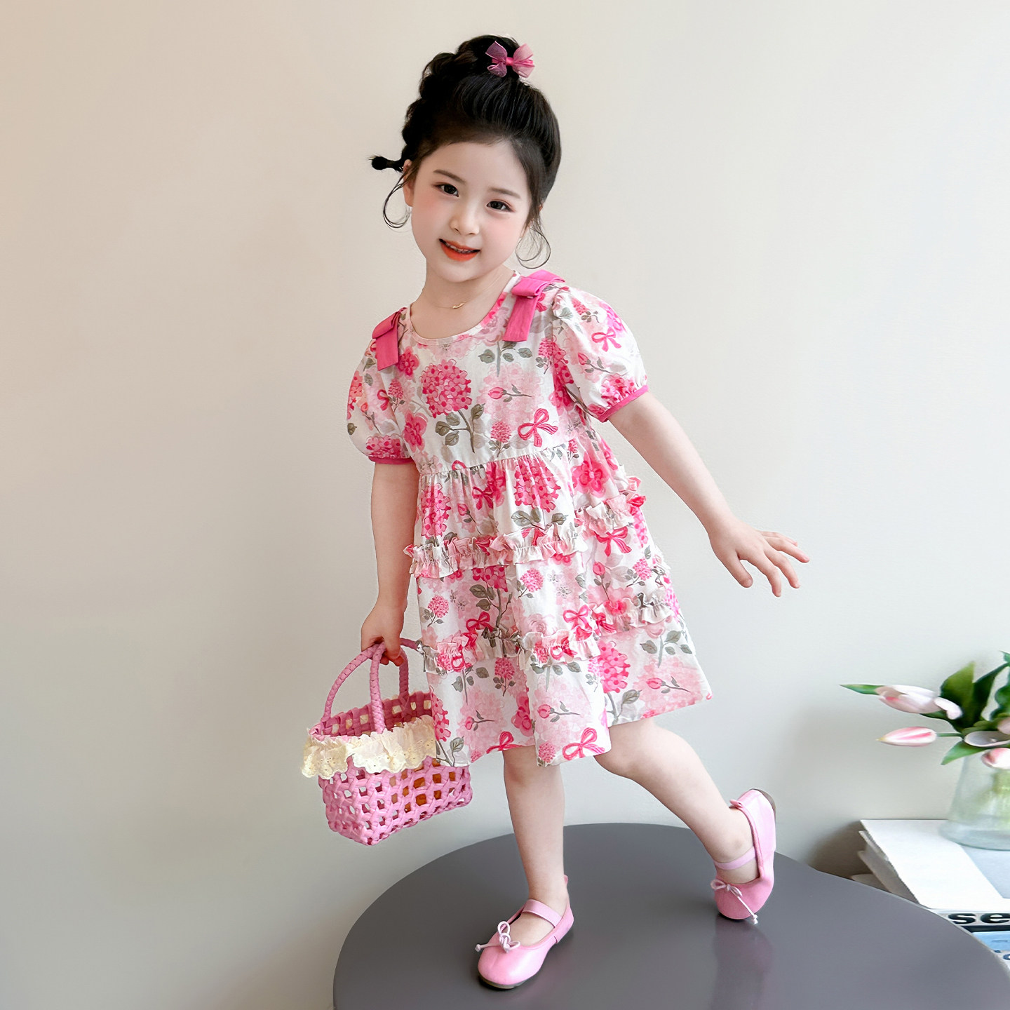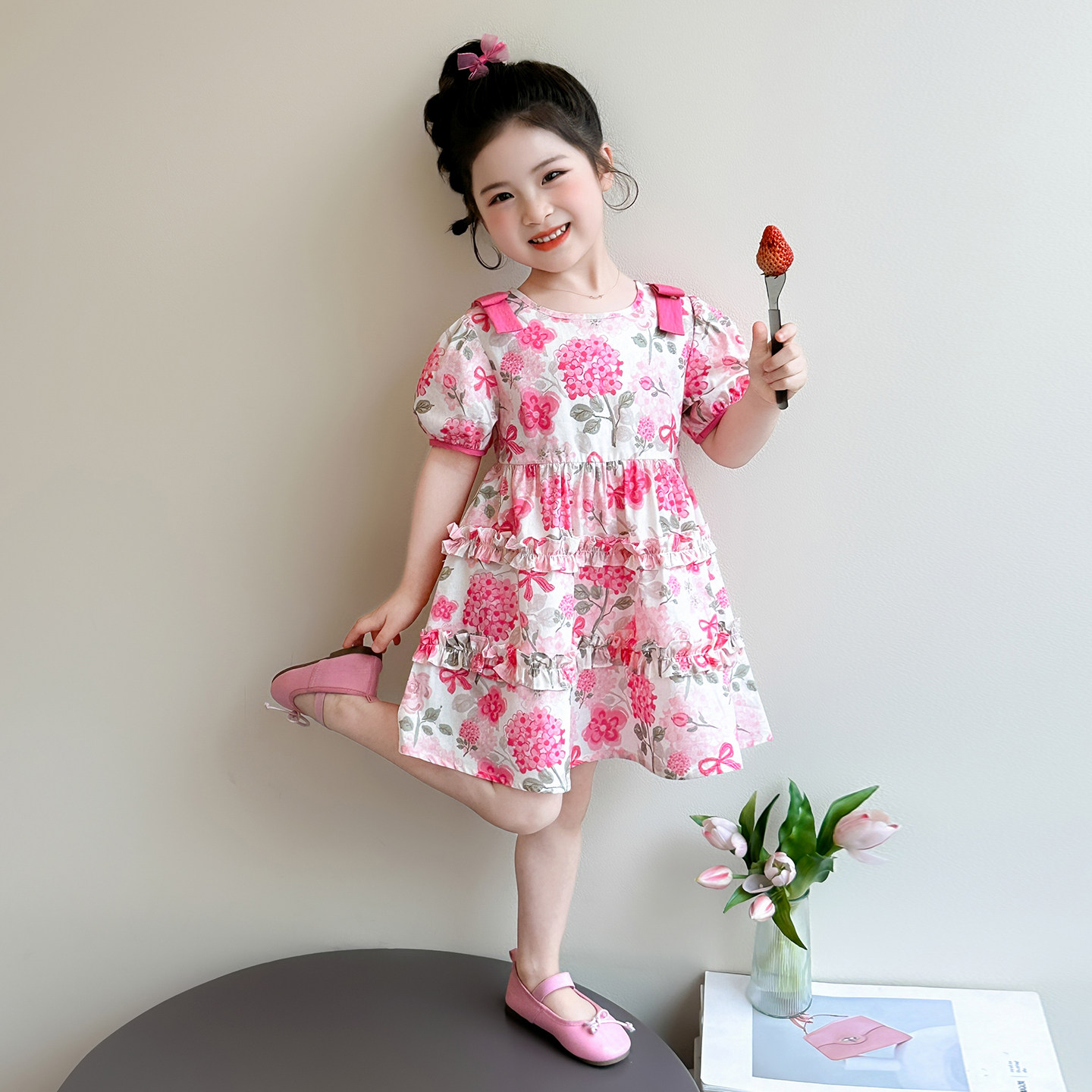 女童甜美碎花连衣裙夏季新款粉红色短袖公主裙洋气女宝宝薄款中裙