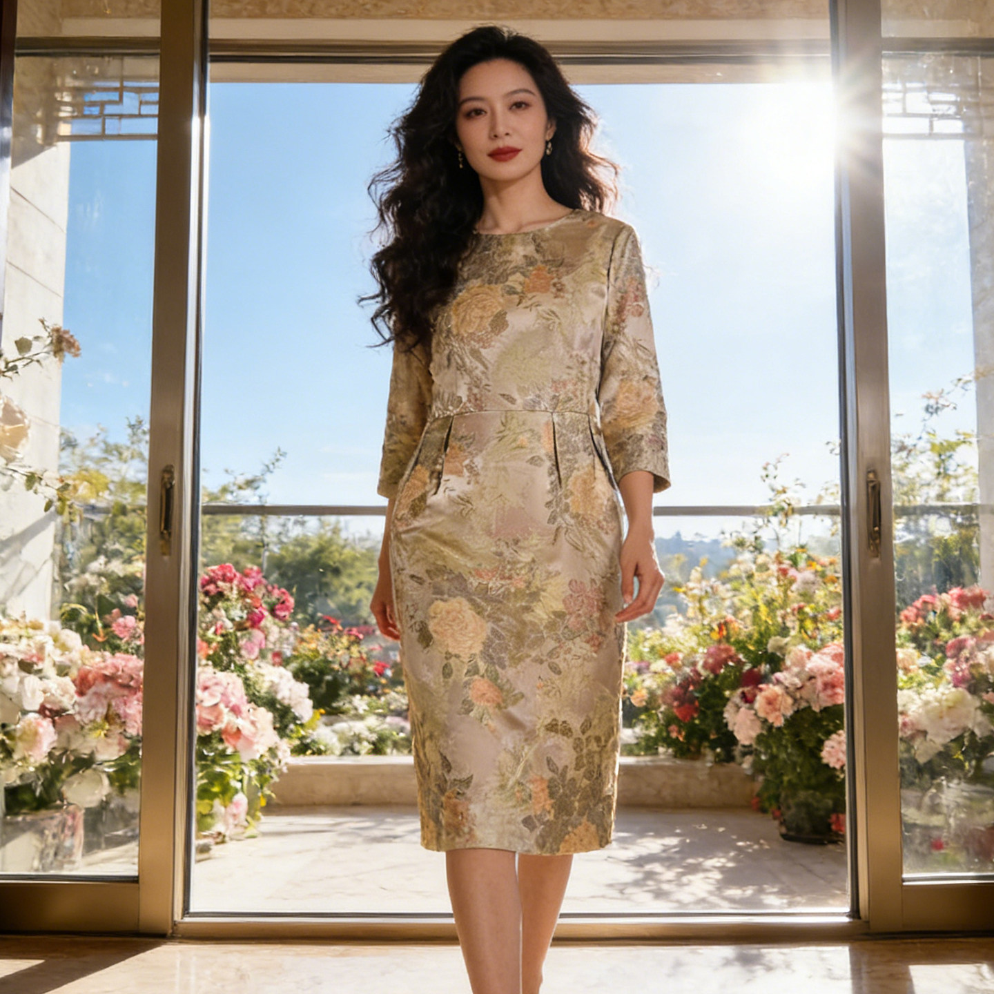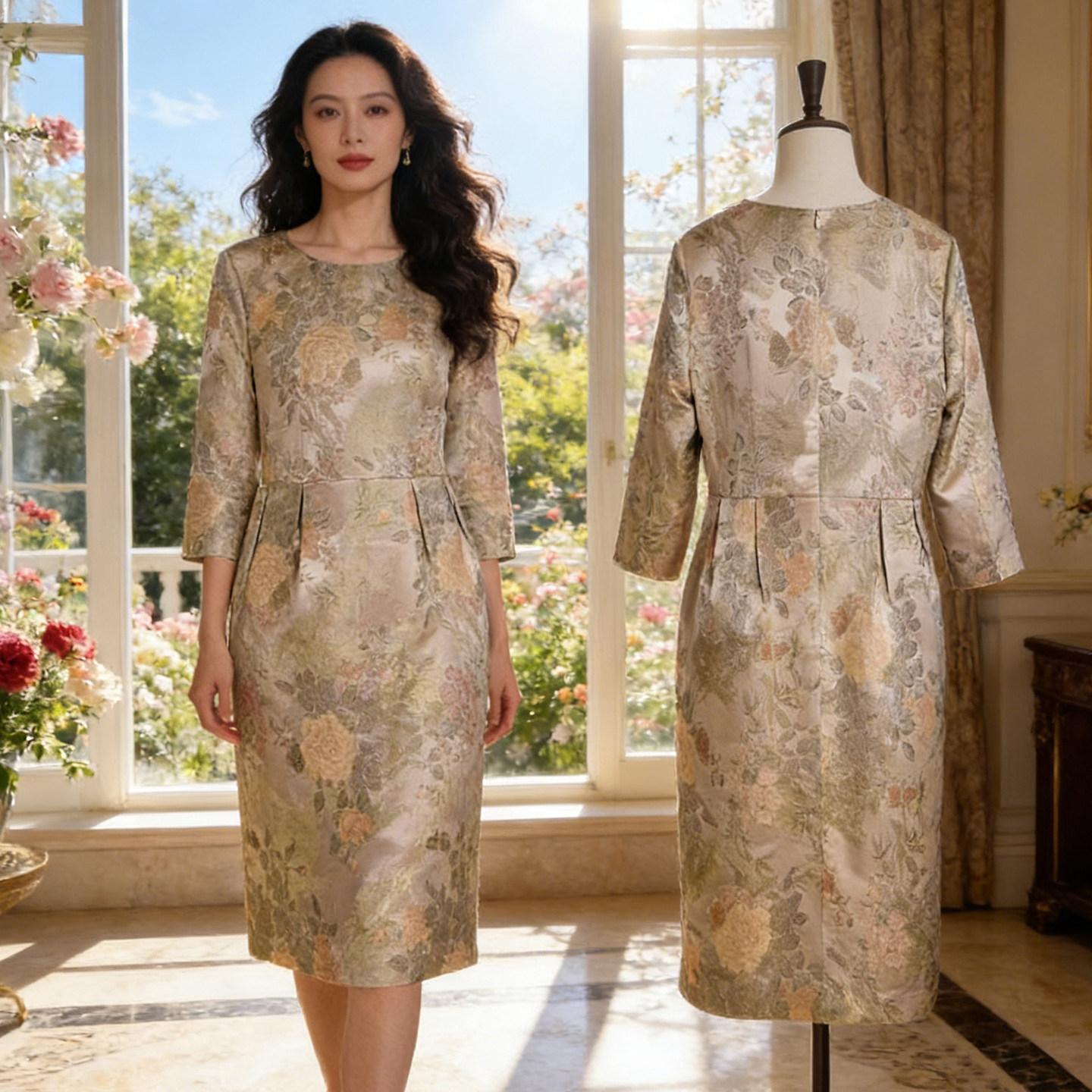 宋锦连衣裙女2026早春新款轻奢圆领正式场合中年女士春季高档裙子