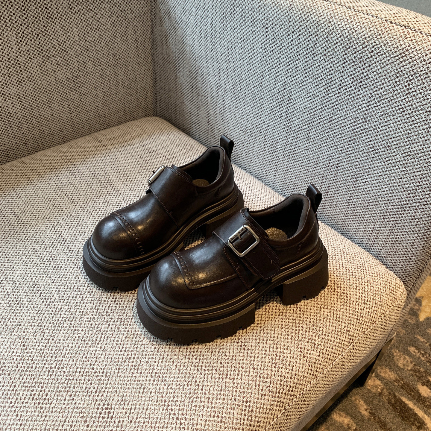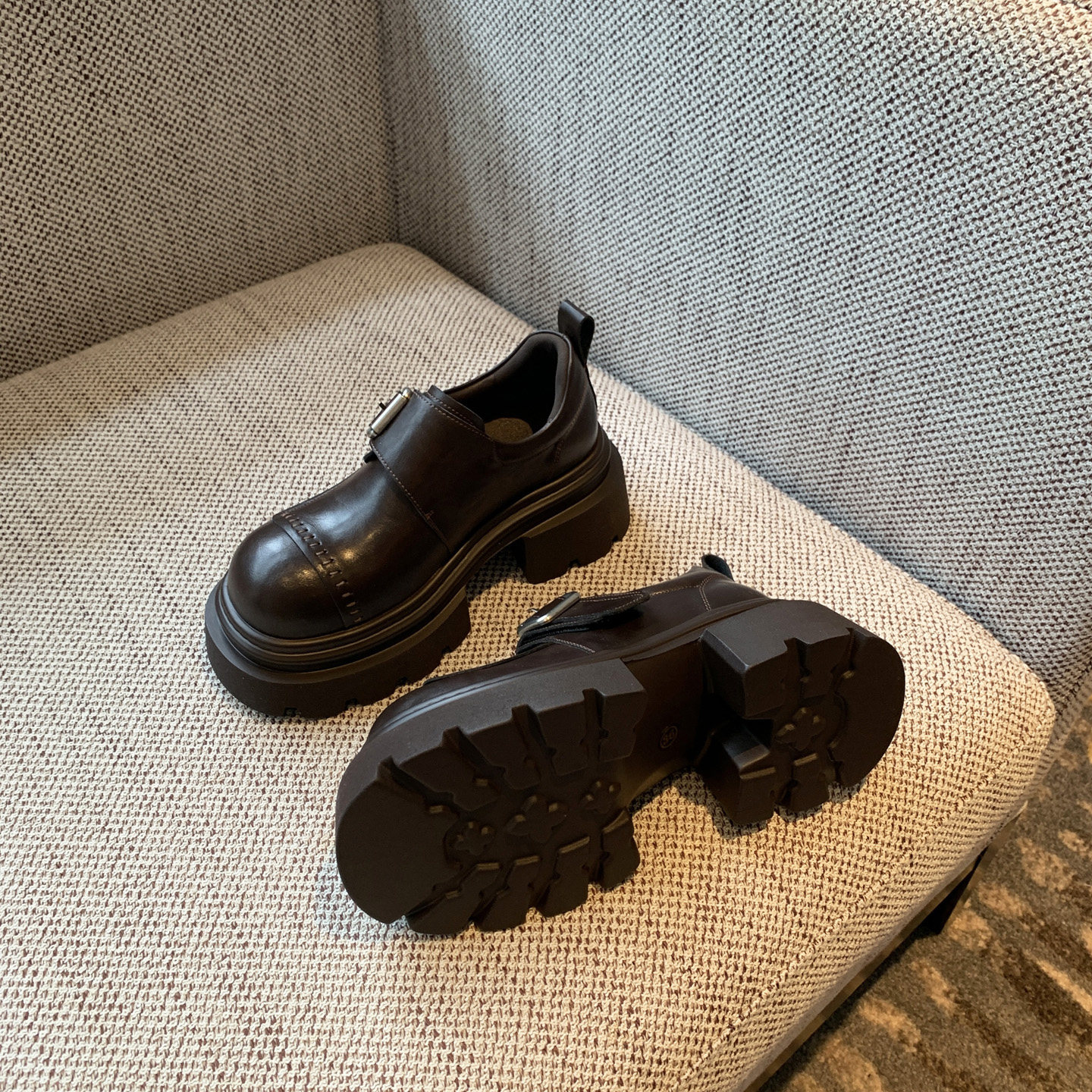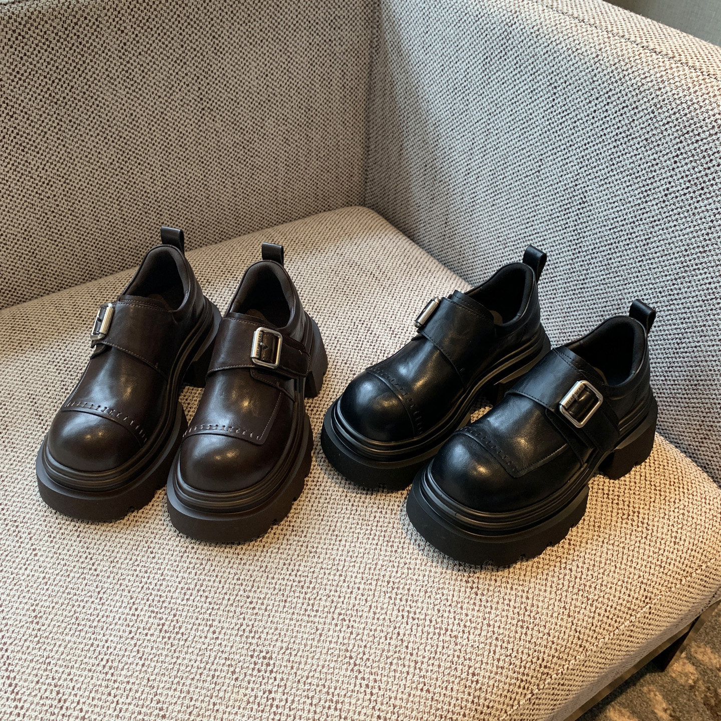 【TFM】复古皮带扣厚底乐福鞋真皮百搭魔术贴增高小皮鞋女英伦风