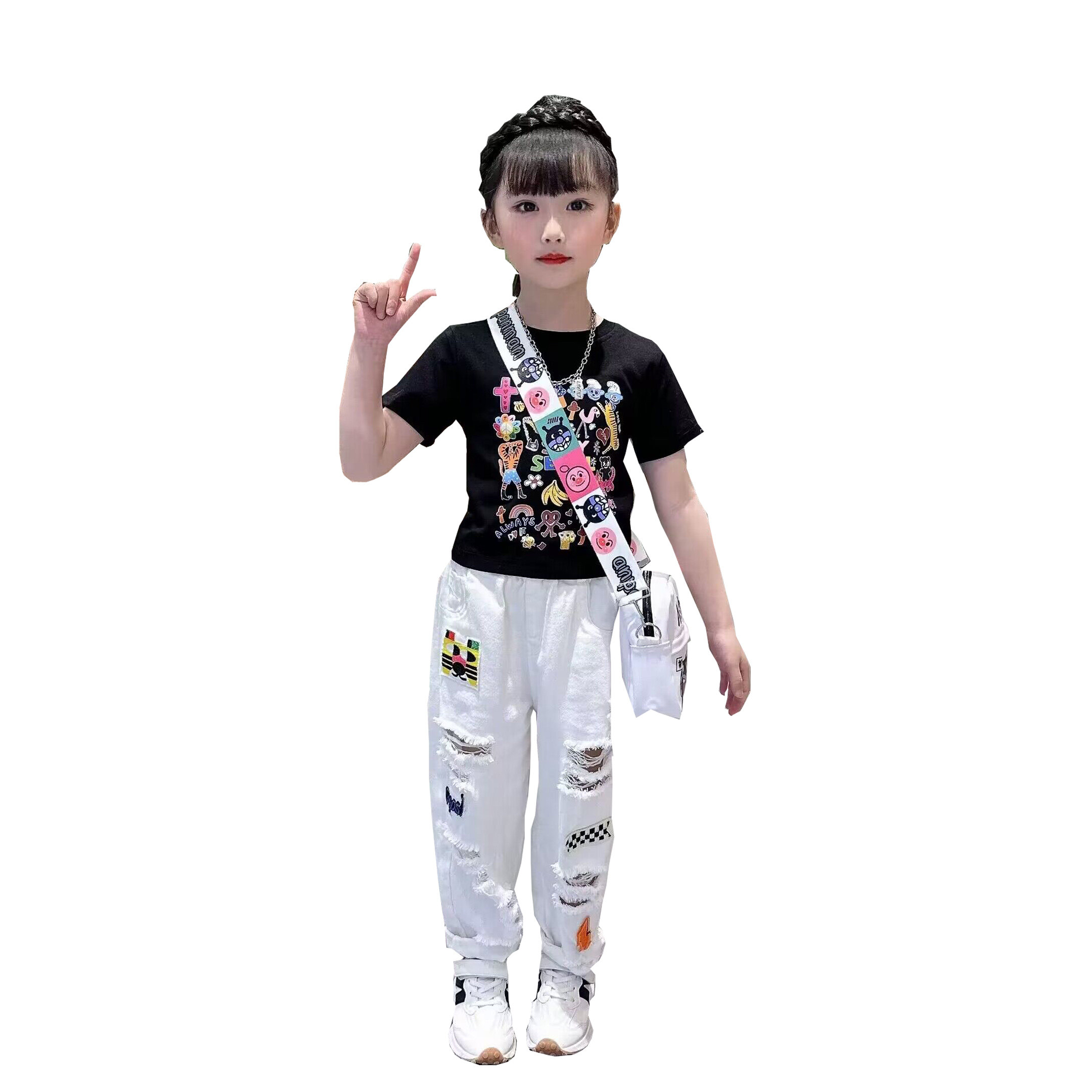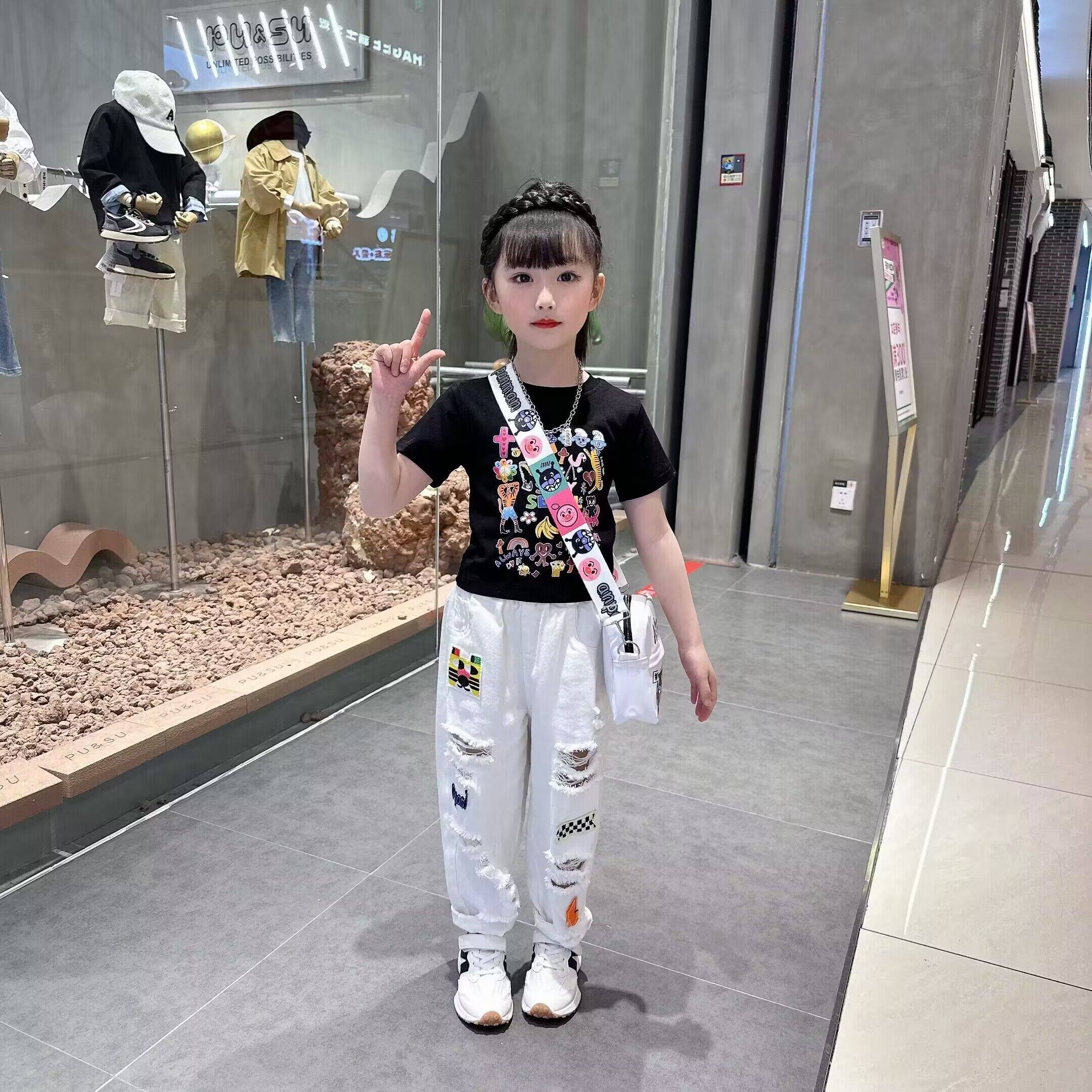 女童夏装运动套装2026新款洋气时尚网红破洞牛仔裤夏季t恤短袖潮