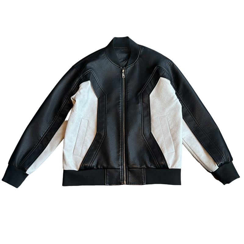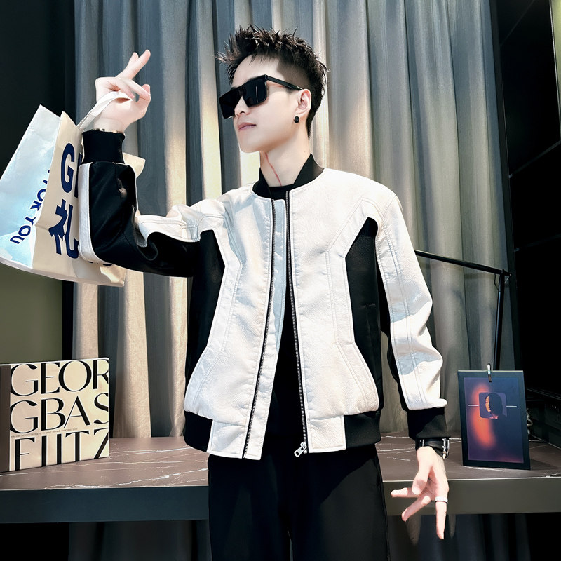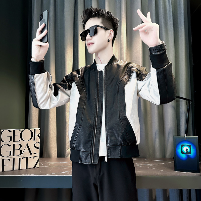 棒球领皮衣外套XS小码男款高级感潮牌撞色休闲盖章春秋季痞帅夹克