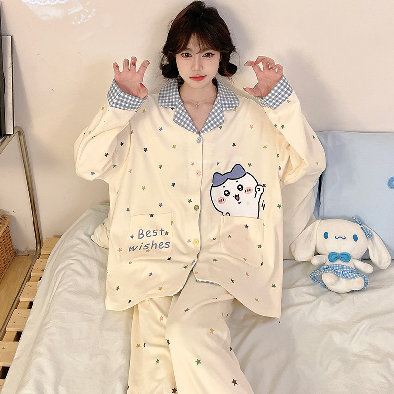 纯棉睡衣女款2026年新款春装大码套装条纹小狗开衫可外穿家居服女
