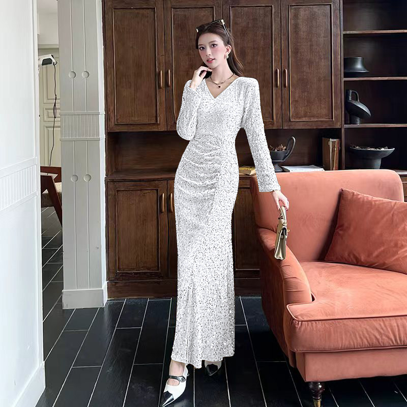 晚礼服女2025新款高级感鱼尾长裙轻奢气质v领长袖修身包臀连衣裙