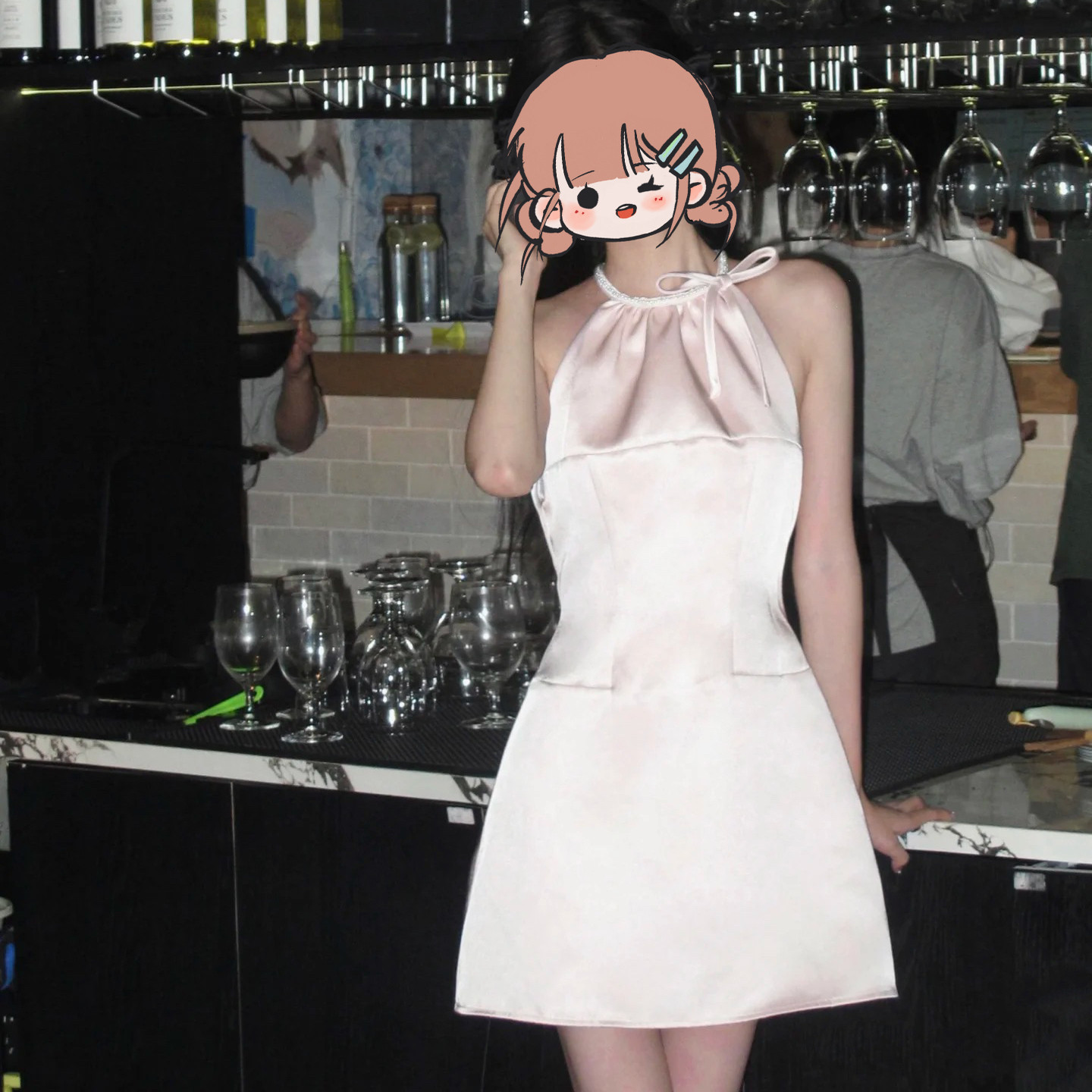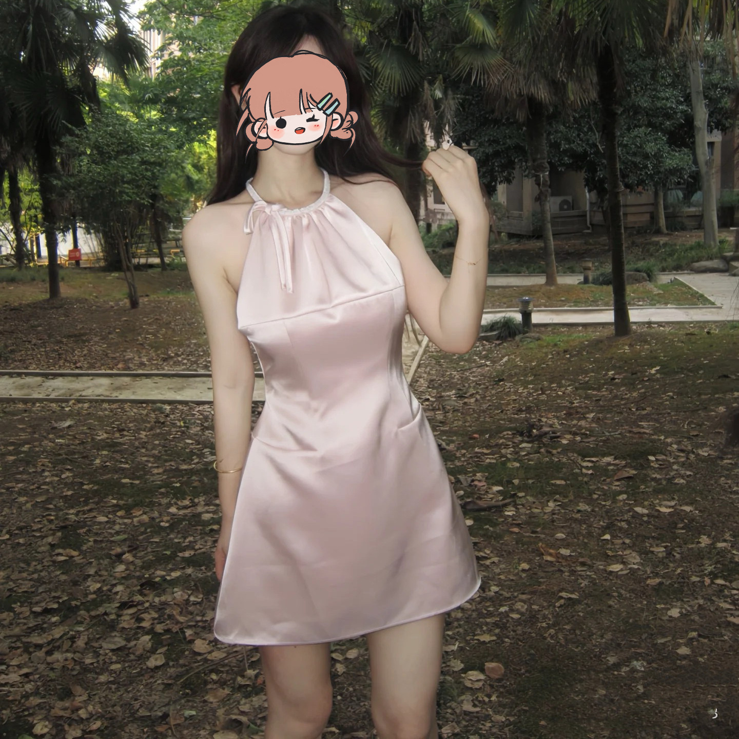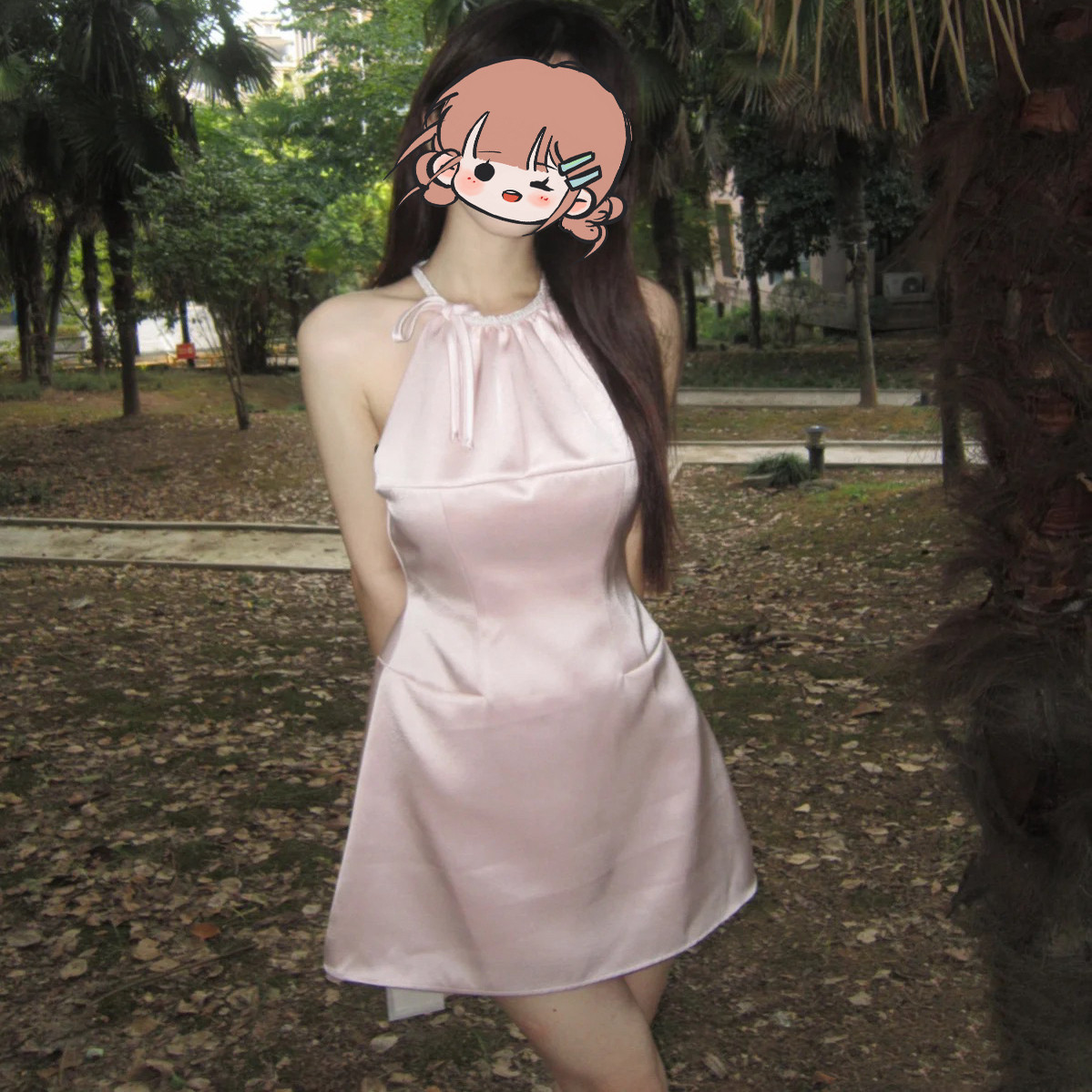 法式高级粉色缎面光泽感挂脖连衣裙女夏季蝴蝶结收腰A字无袖短裙