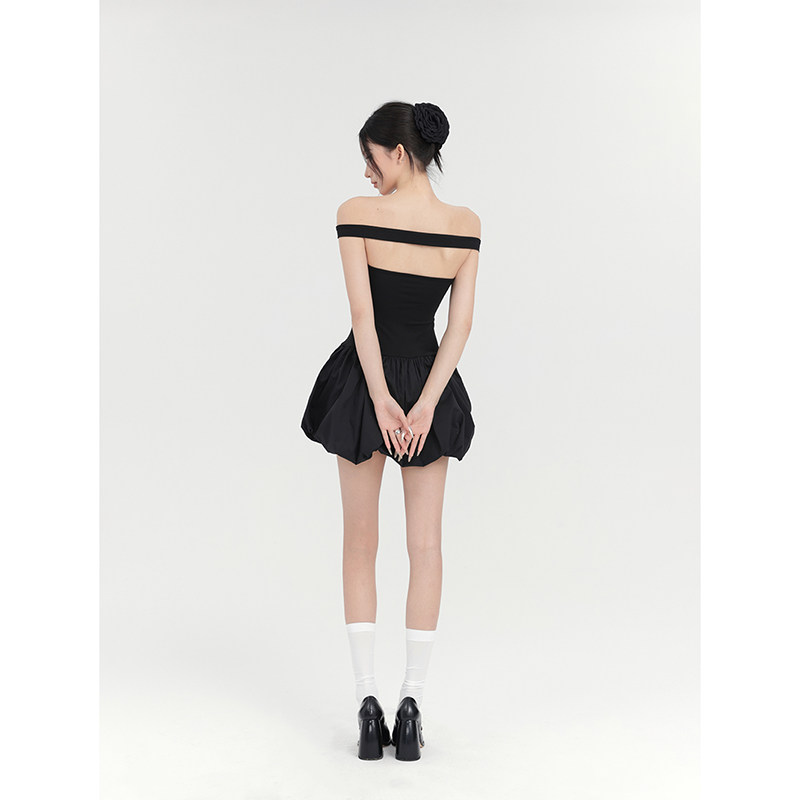 PEMPL 一字肩连衣裙女夏季新款高级感收腰显瘦蓬蓬裙露背短款裙子
