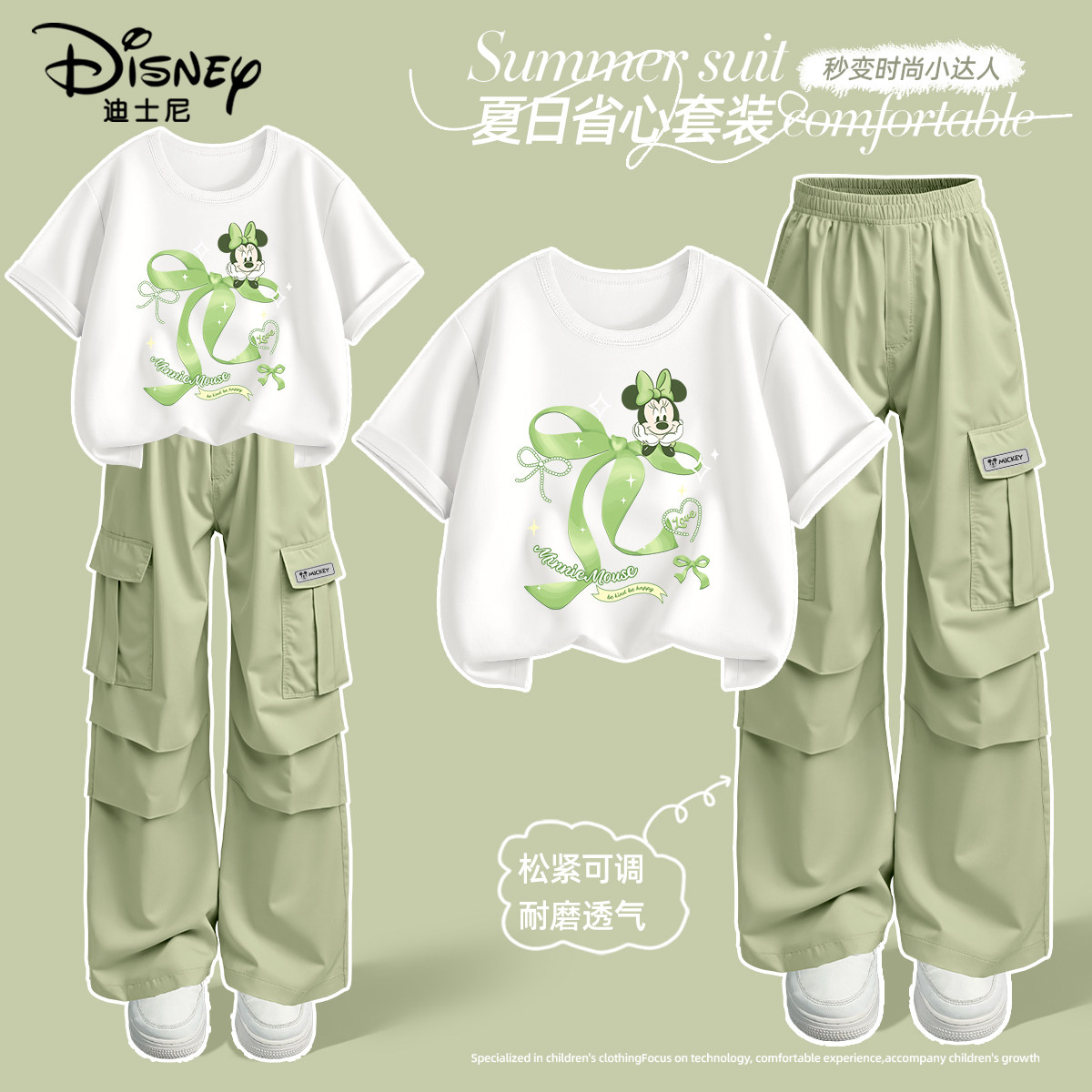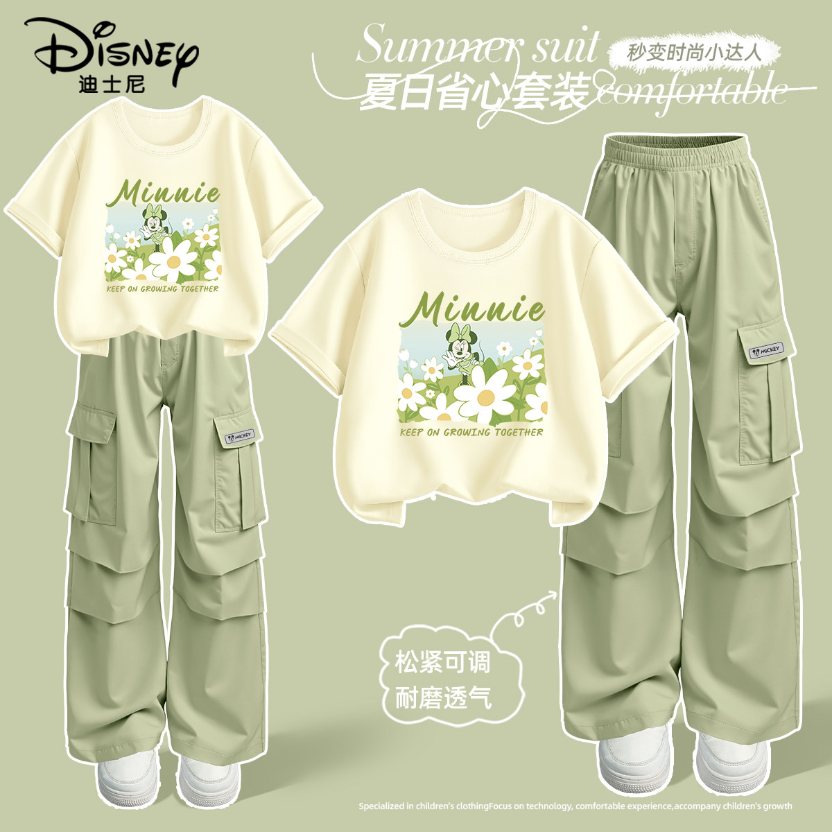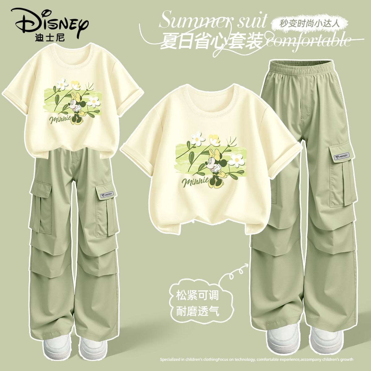 迪士尼女童夏季套装薄款工装裤2026新款运动装儿童纯棉短袖t恤夏