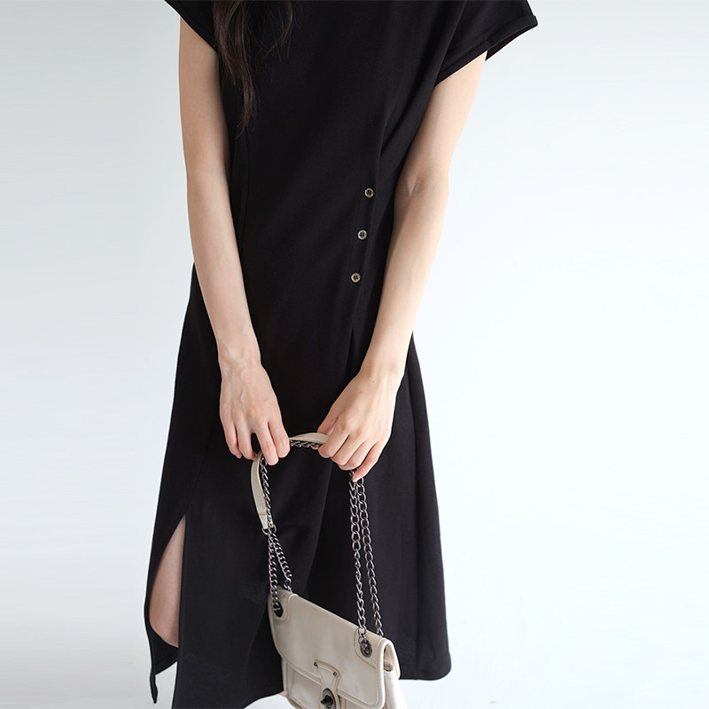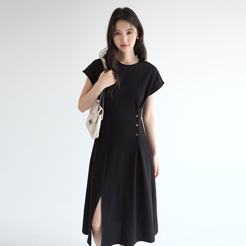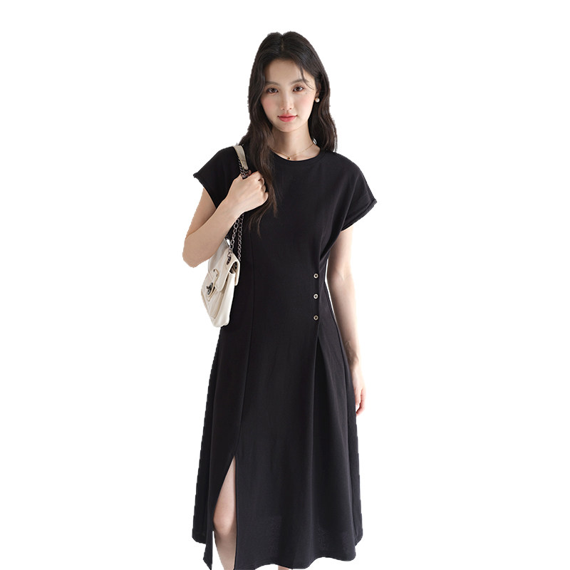311线报网描述:设计感纽扣收腰T恤裙气质开叉黑色a字连衣裙