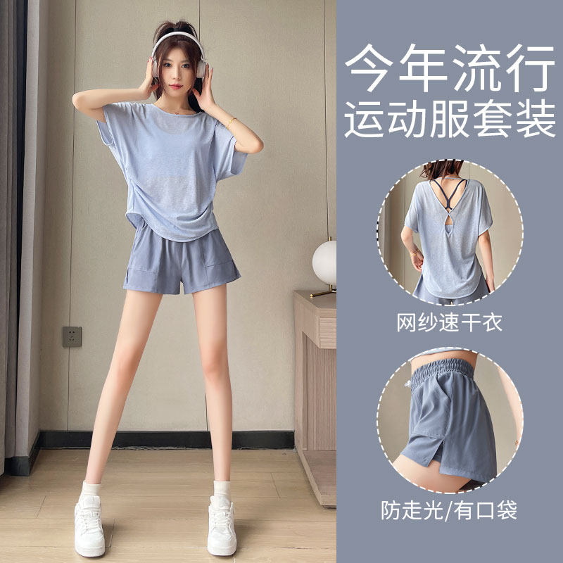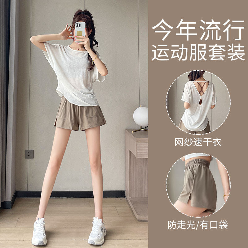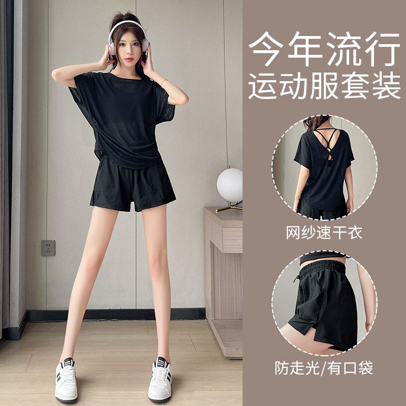 跑步运动套装女夏薄款晨跑服时尚宽松网纱罩衫短袖速干短裤健身衣