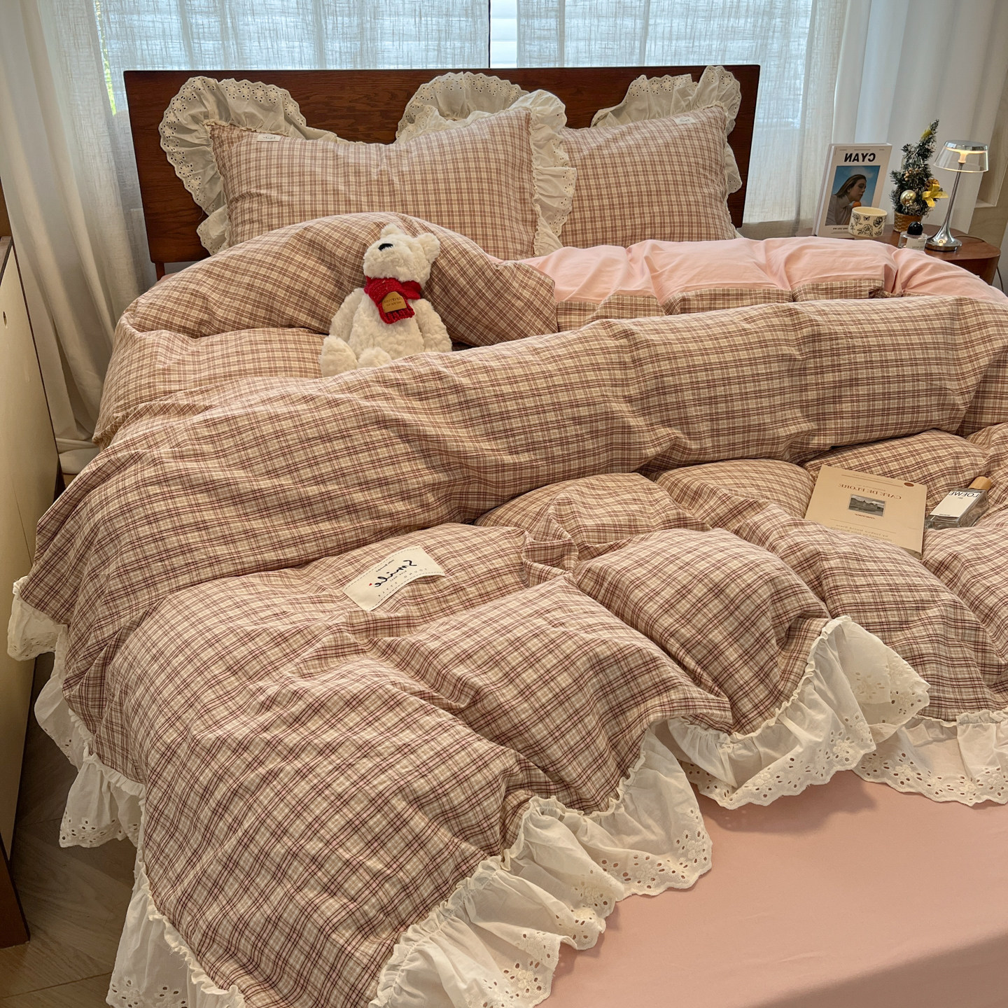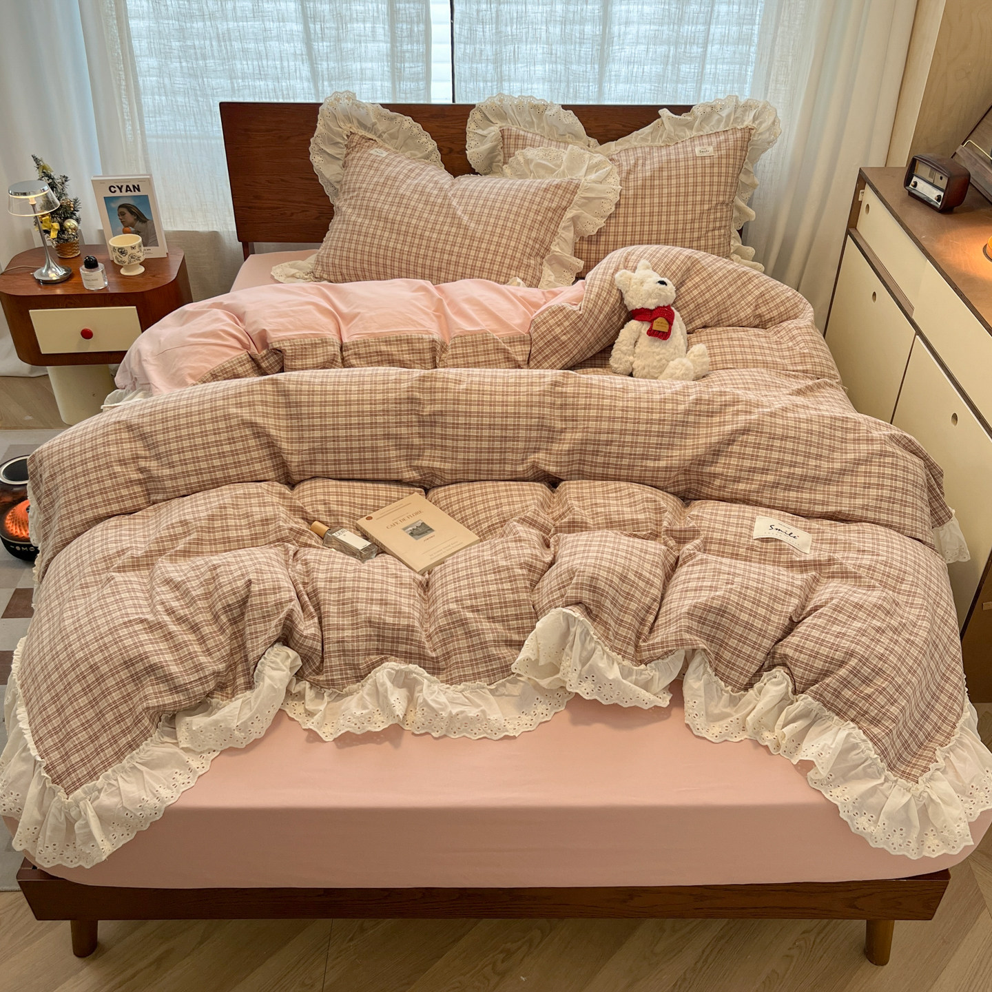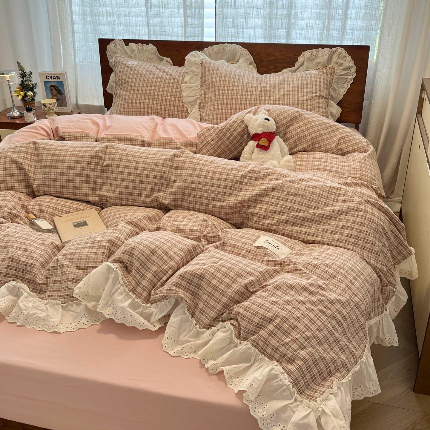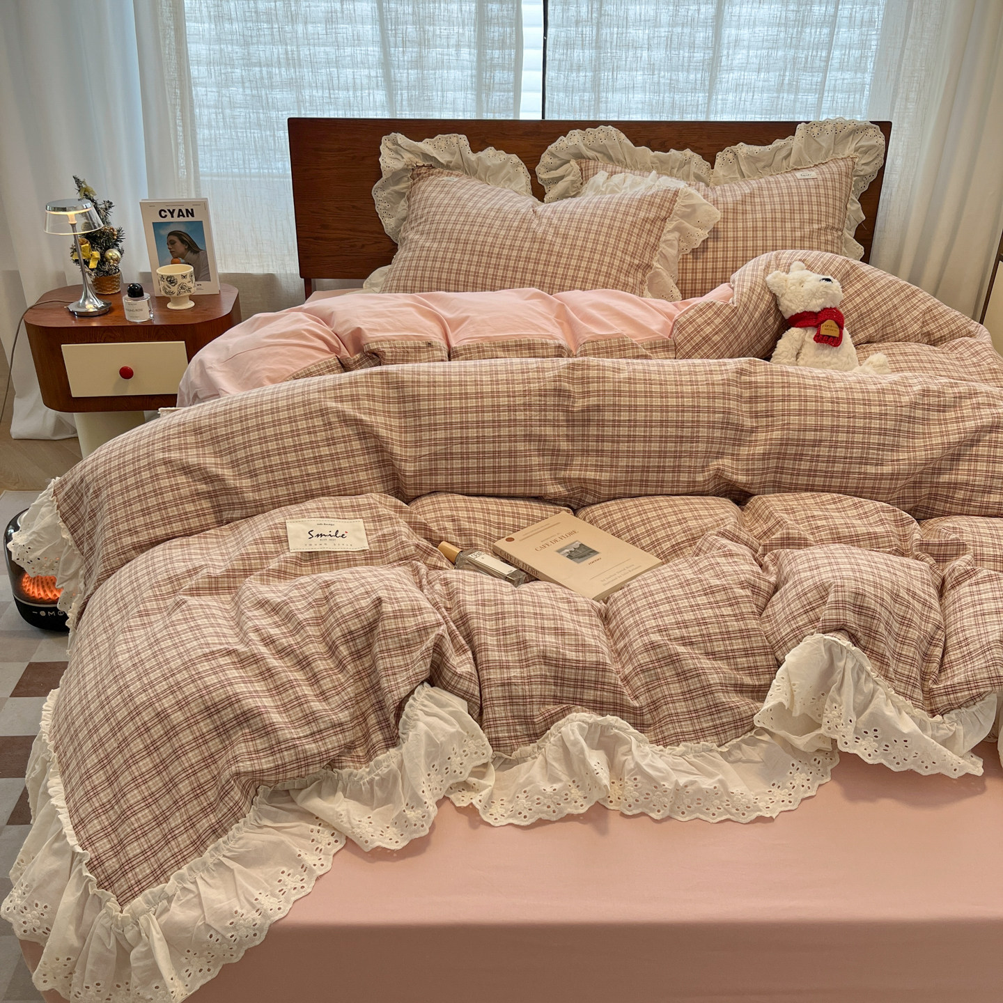 2026新款韩系花边款纯棉蕾丝全棉公主风纯色风色织格四件套-漫语