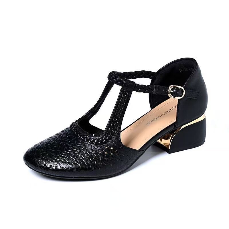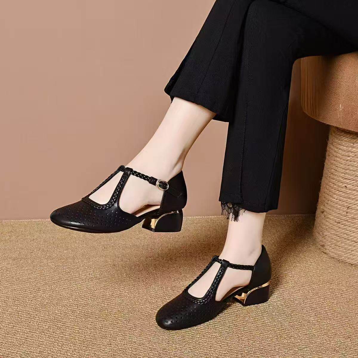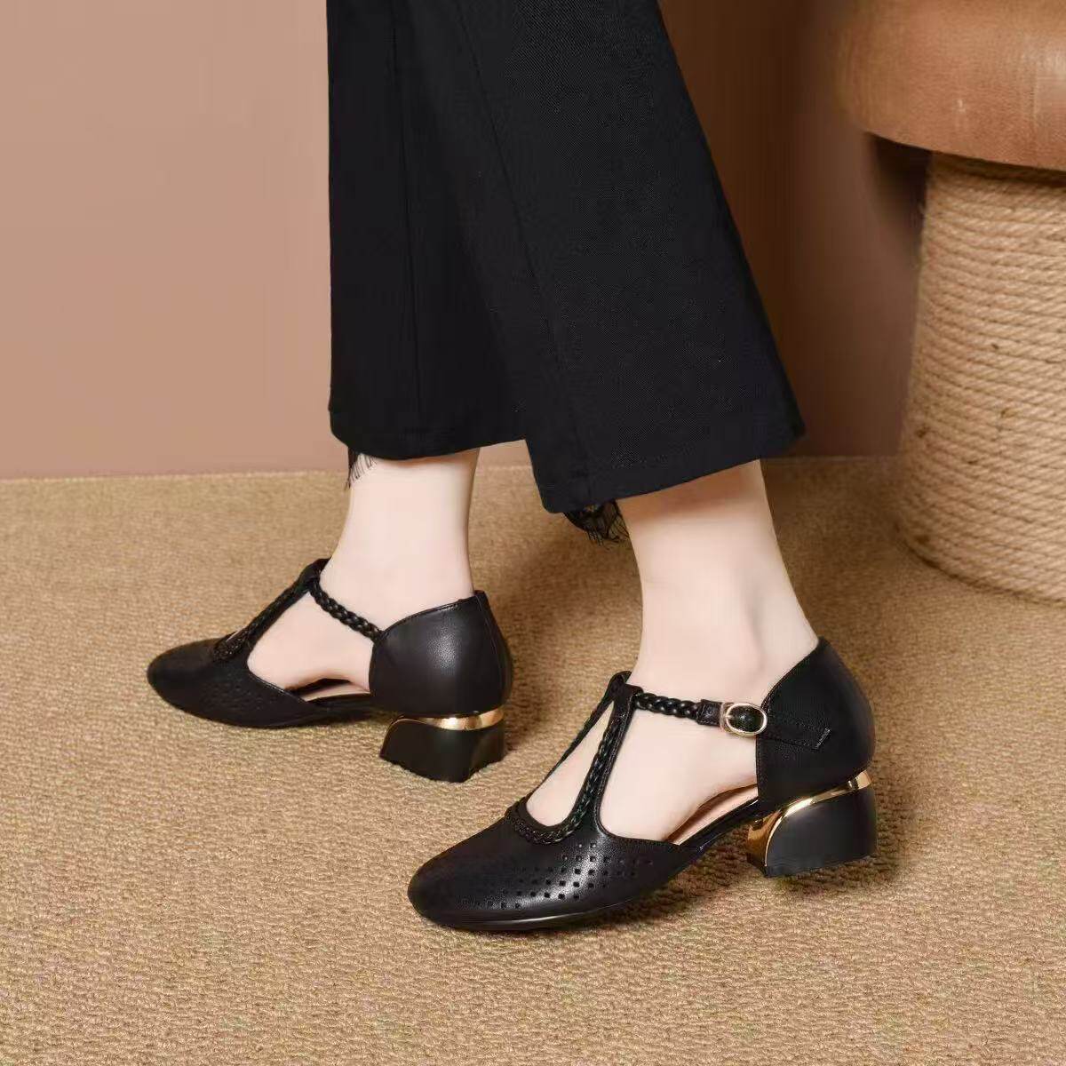 2026新款夏季包头凉鞋女真皮粗跟中跟女鞋单鞋妈妈凉皮鞋百搭浅口