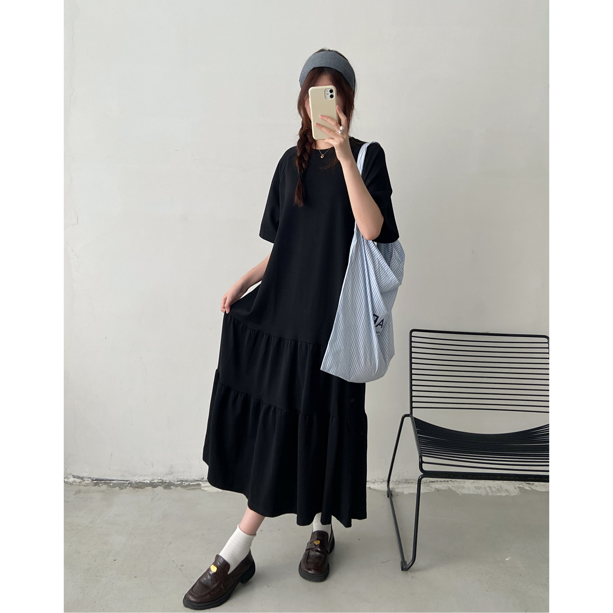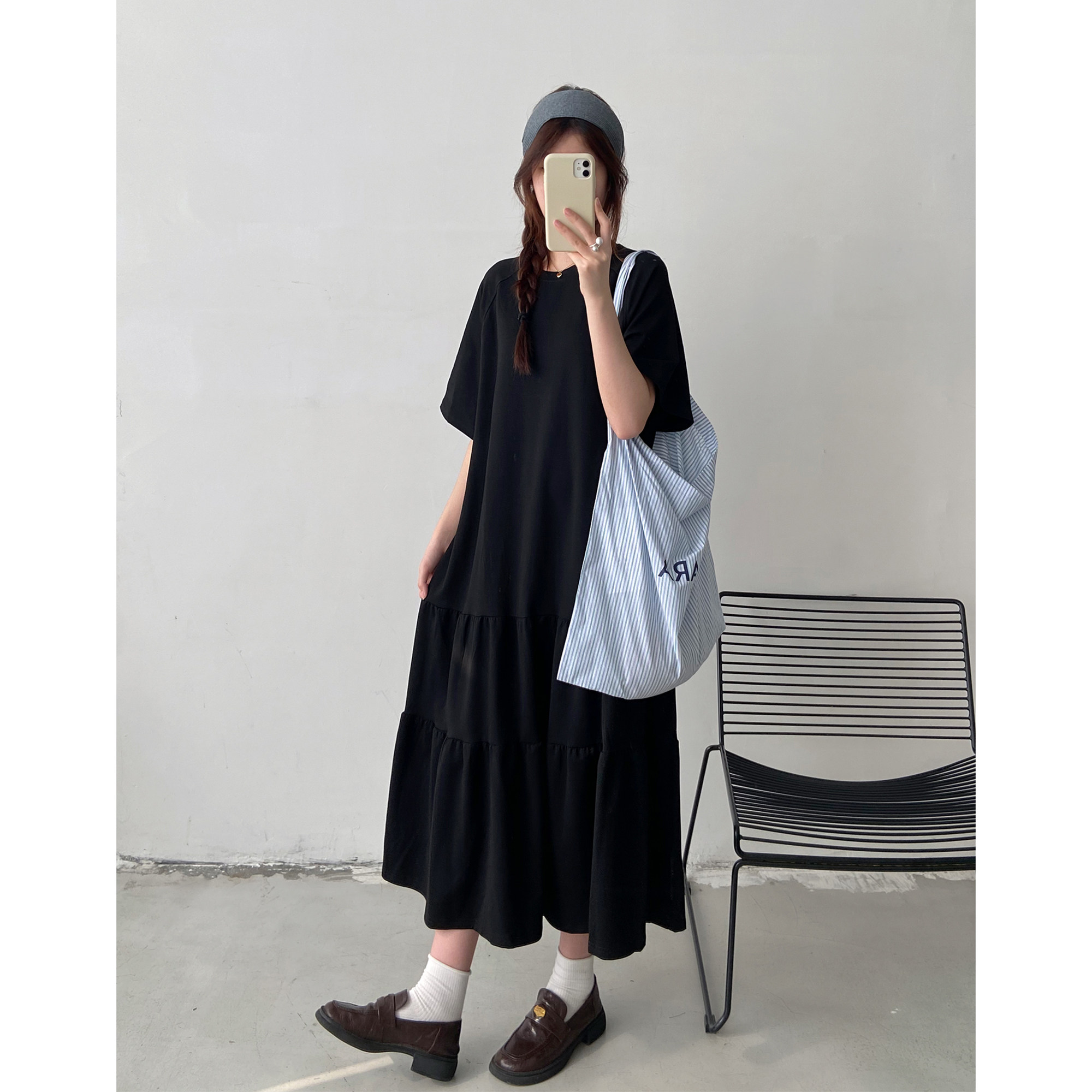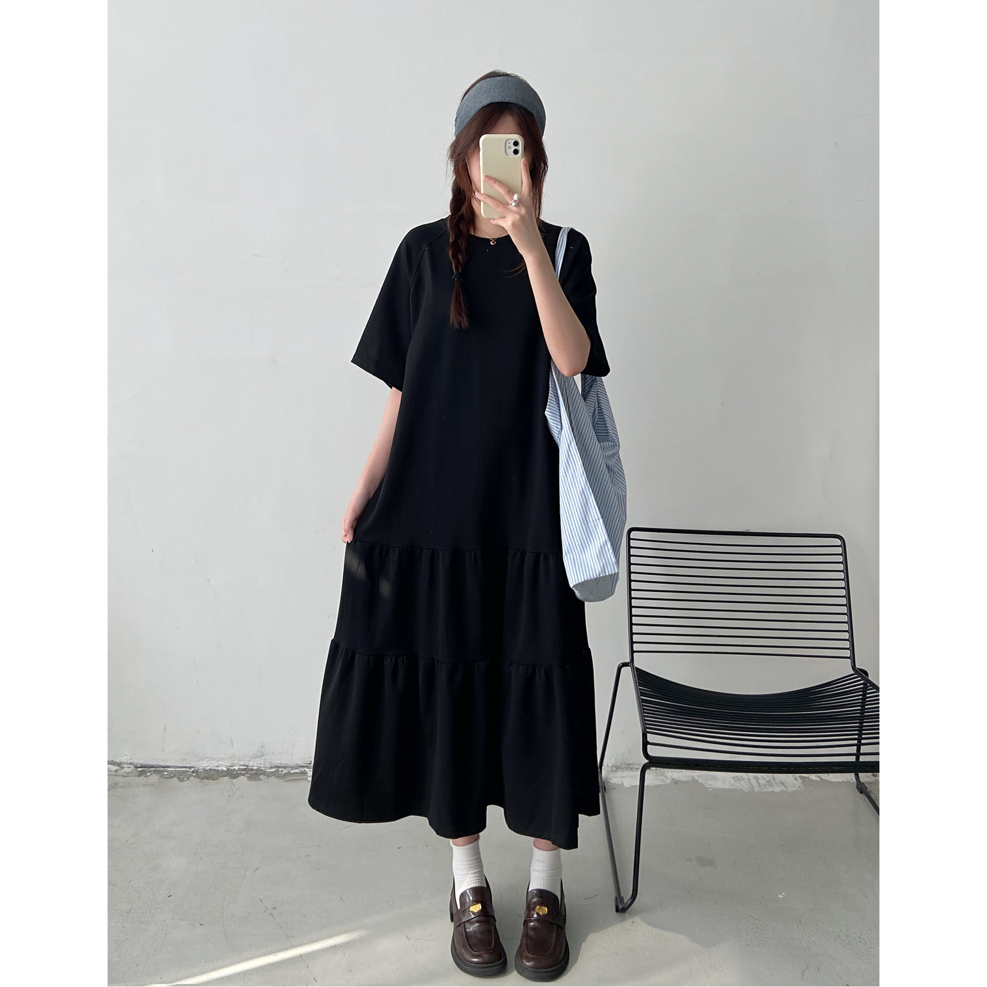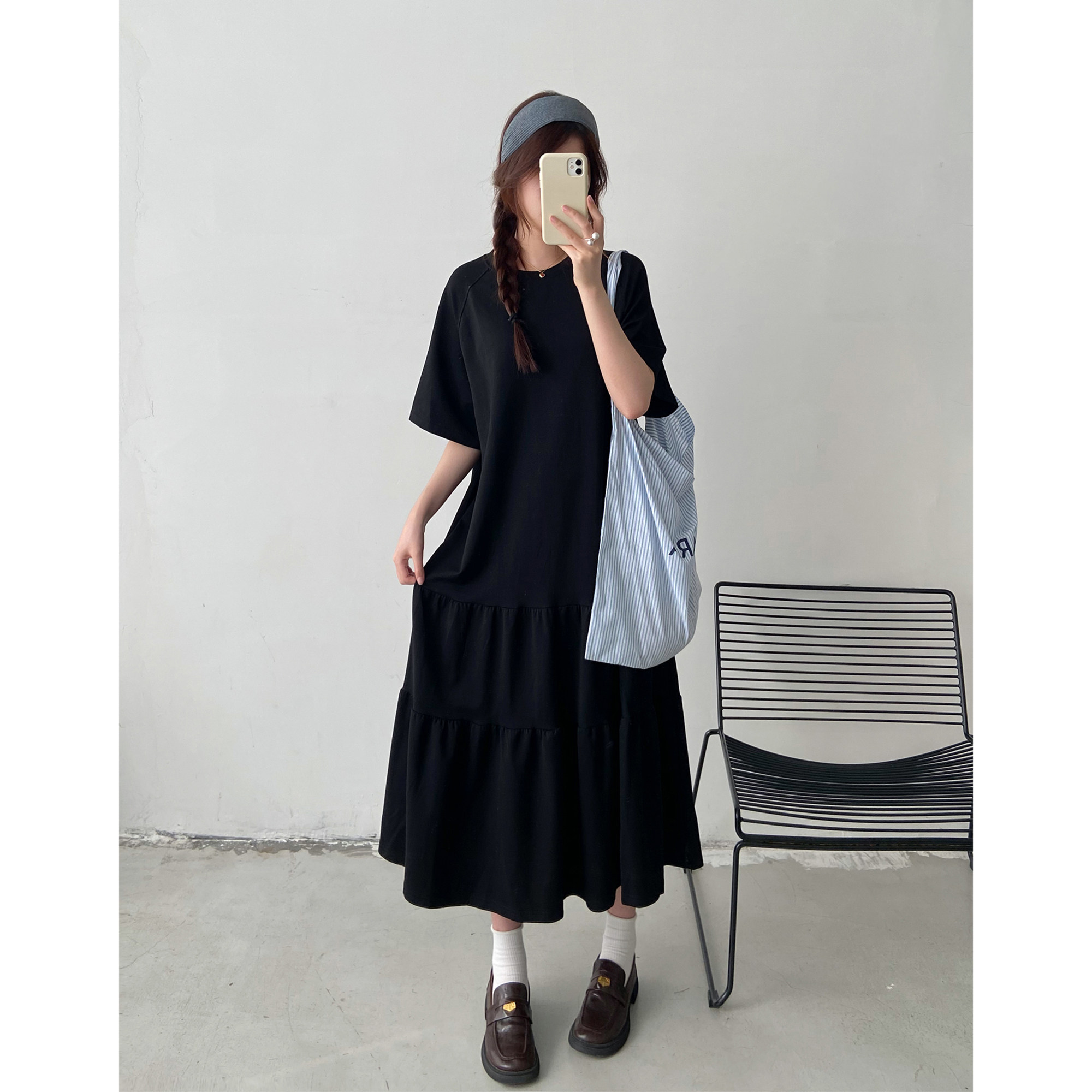 黑色拼接短袖连衣裙女2026夏季新款胖mm宽松显瘦过膝休闲鱼尾长裙