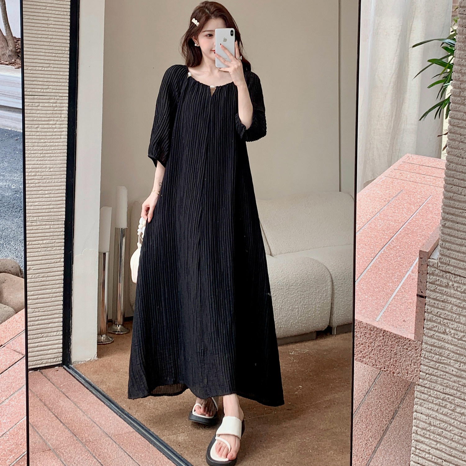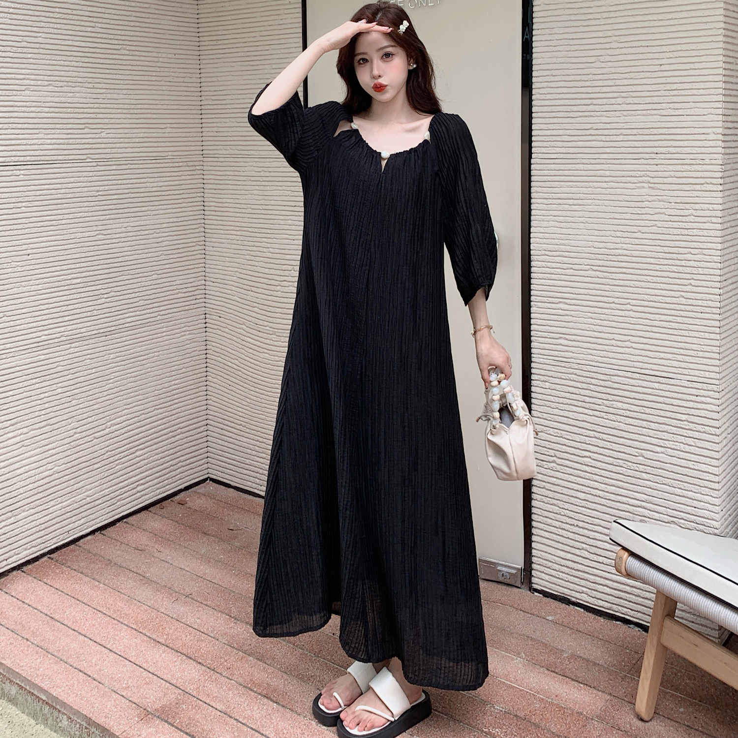 夏季新款大码女装胖mm宽松显瘦法式气质短袖连衣裙镂空长款小黑裙