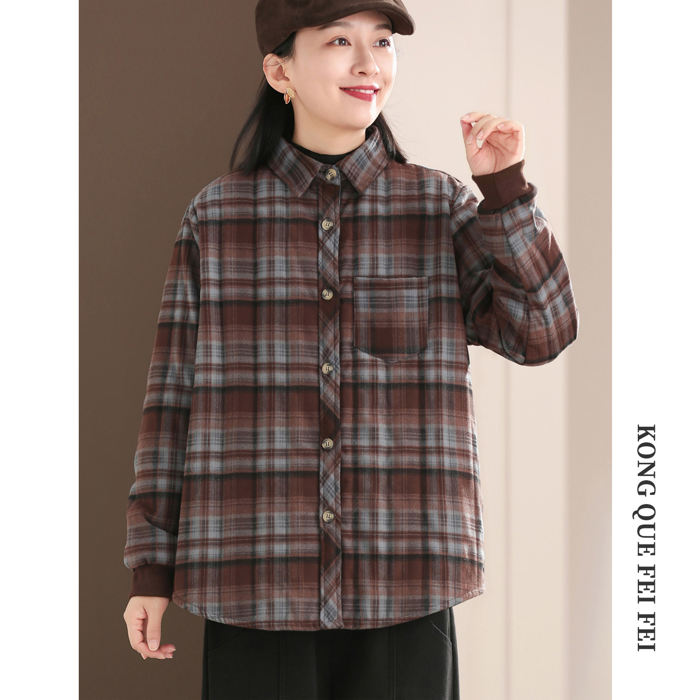 孔雀飞飞冬装韩版大码遮肉格子复古休闲棉衣女款爆款2025新款薄款