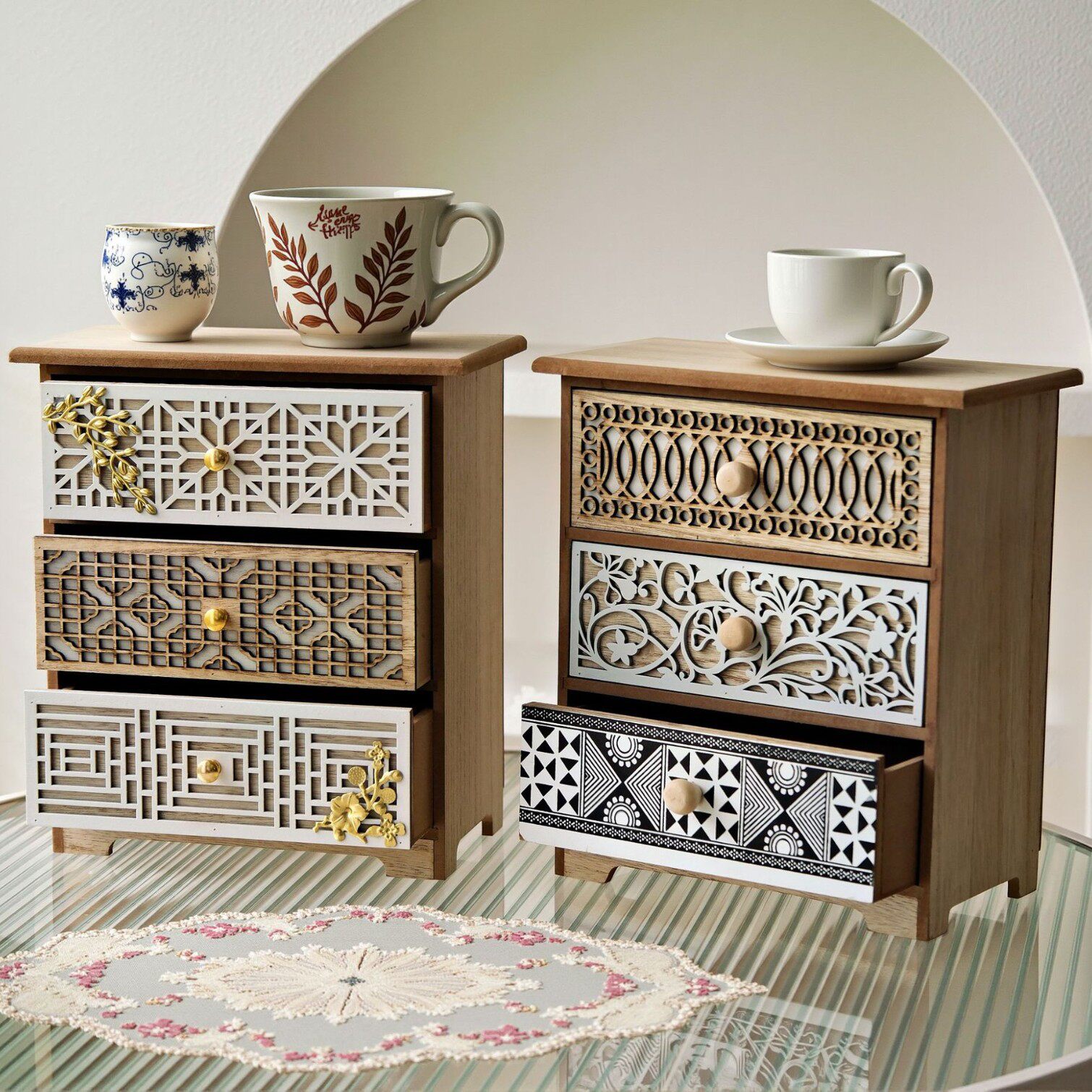 木质家用复古雕花镂空桌面收纳柜抽屉式多层收纳防尘实木储物柜