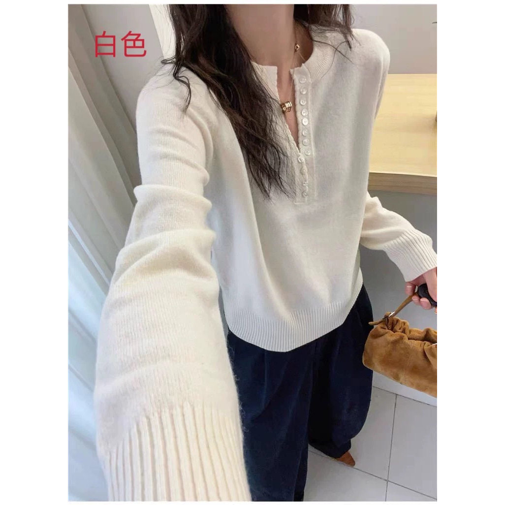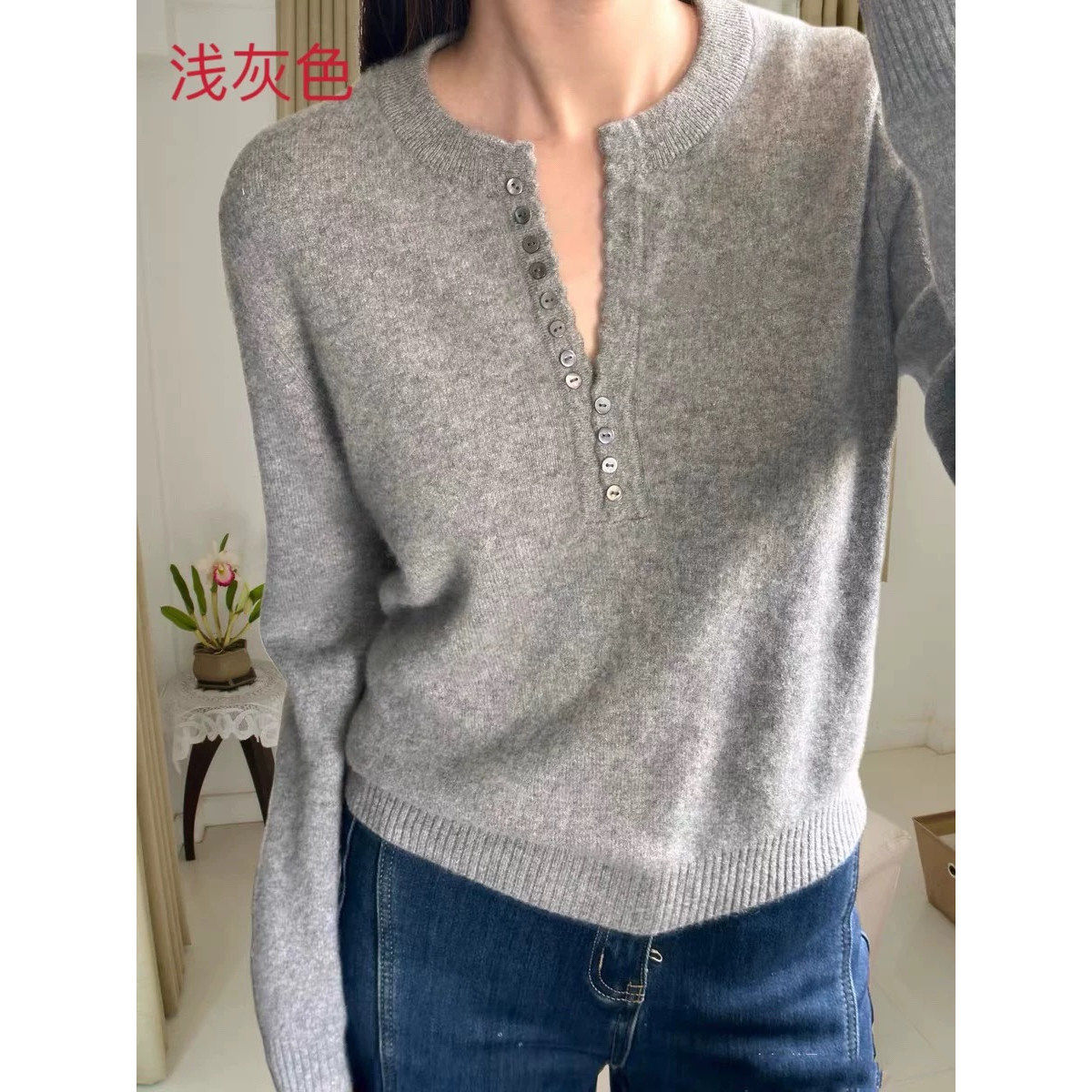 格雷系多纽扣V领羊毛针织衫女套头宽松通勤风毛衣打底衫上衣