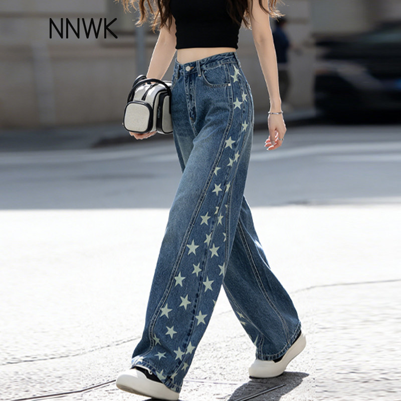 美式高街星星印花弯刀牛仔裤女款新款爆款春秋网红裤子宽松阔腿裤