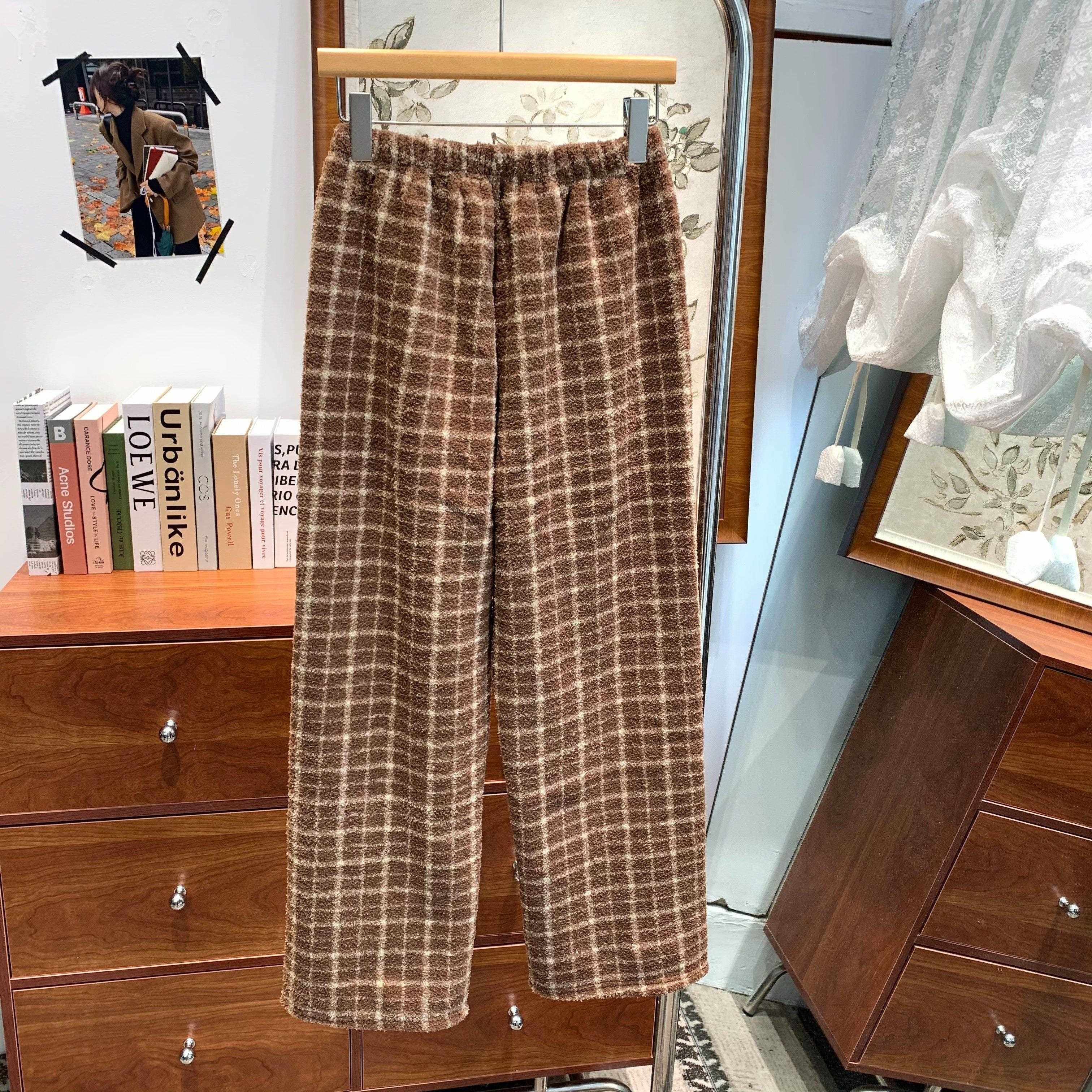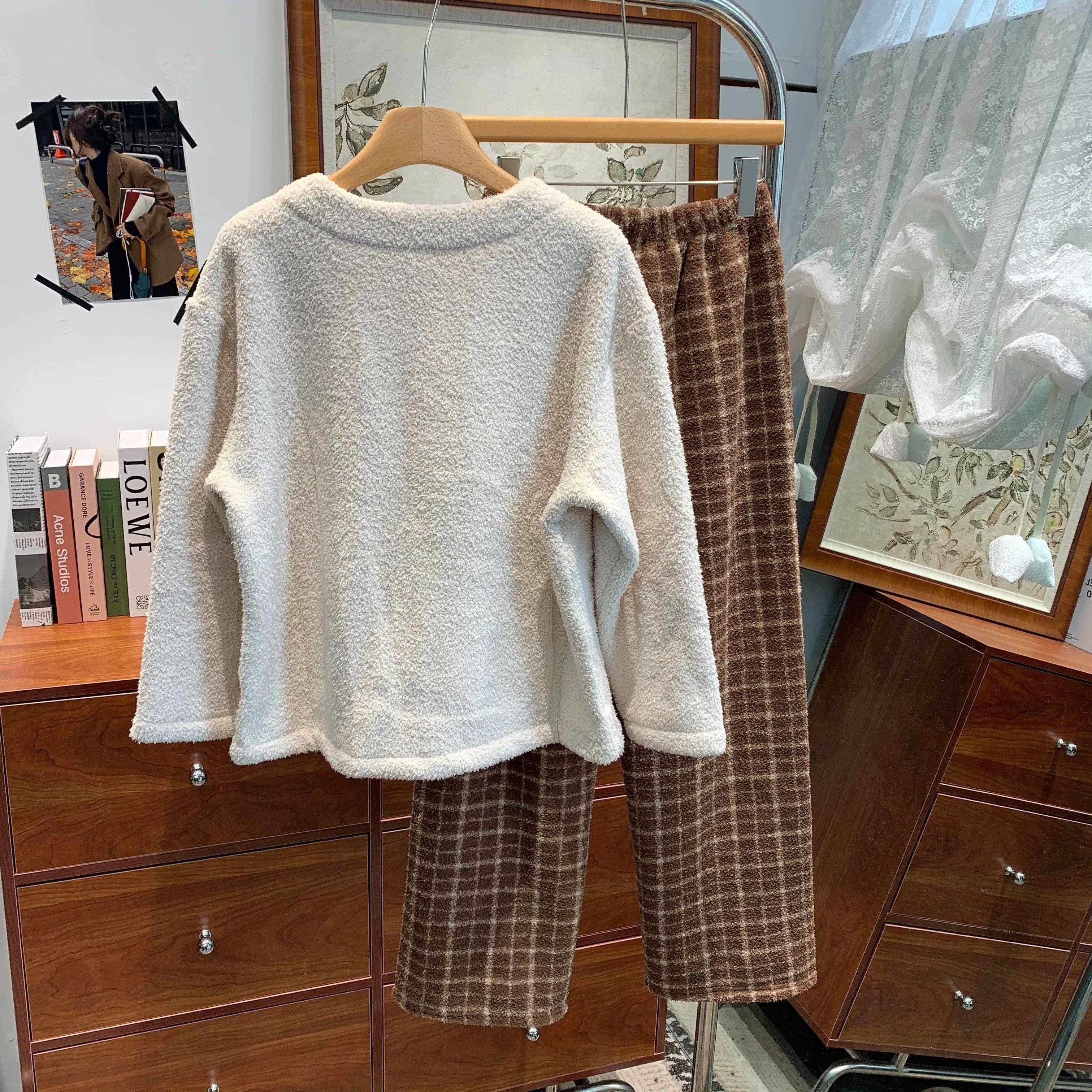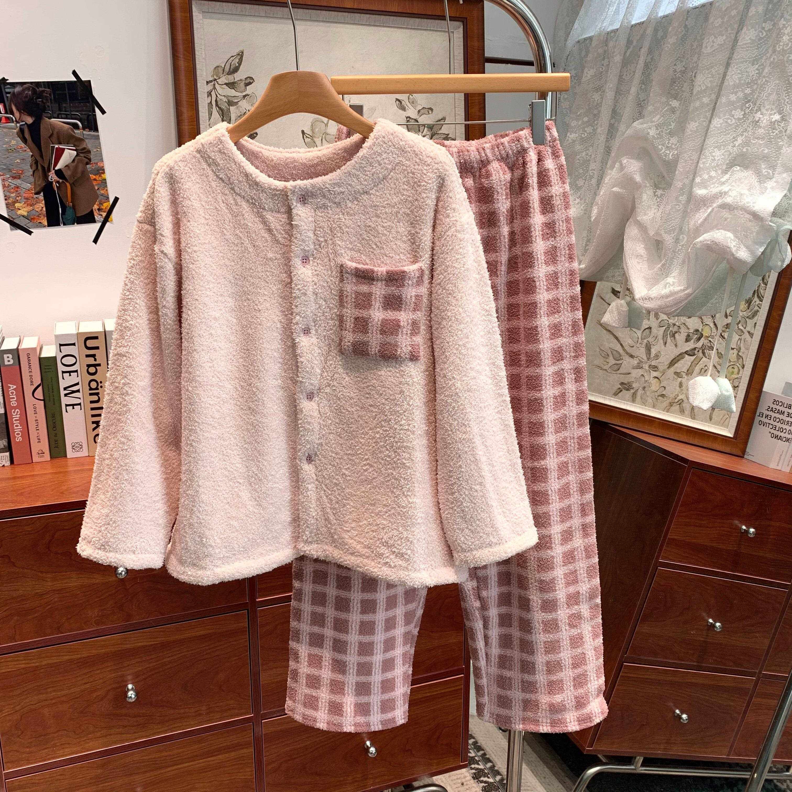 韩版撞色格子圆领开衫珊瑚绒睡衣女秋冬小个子外穿加厚保暖家居服