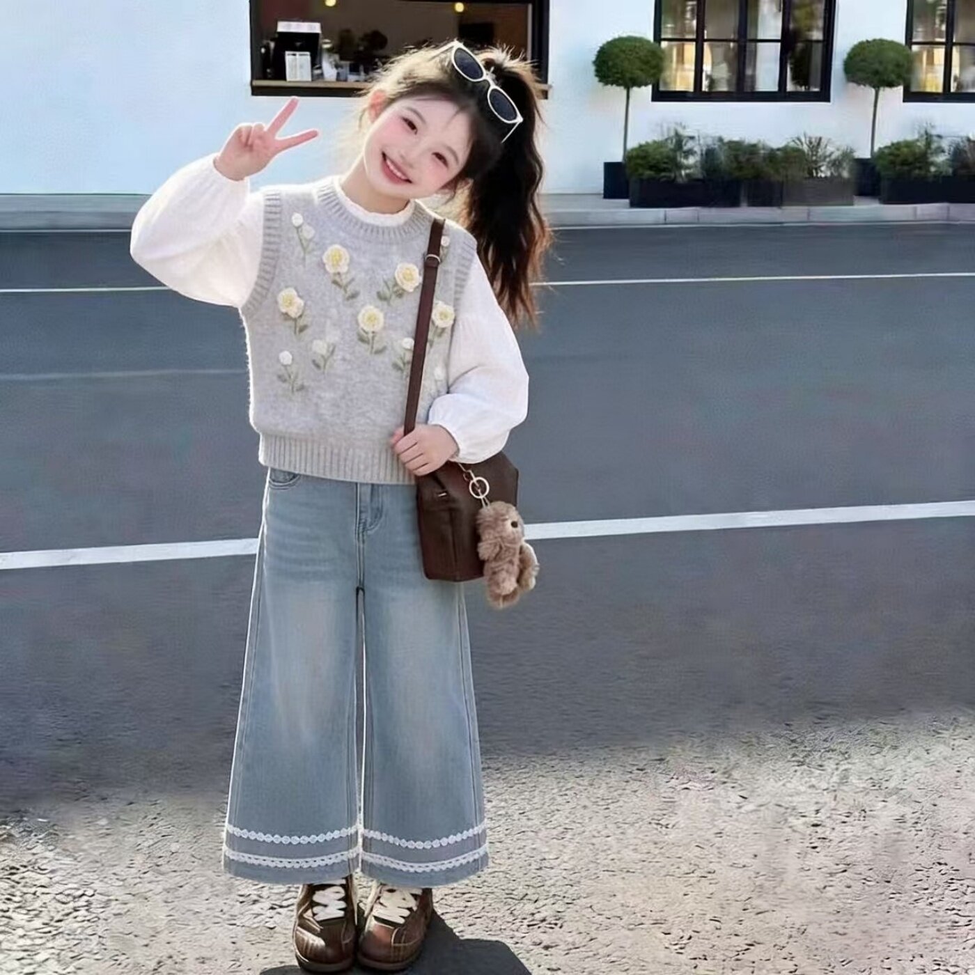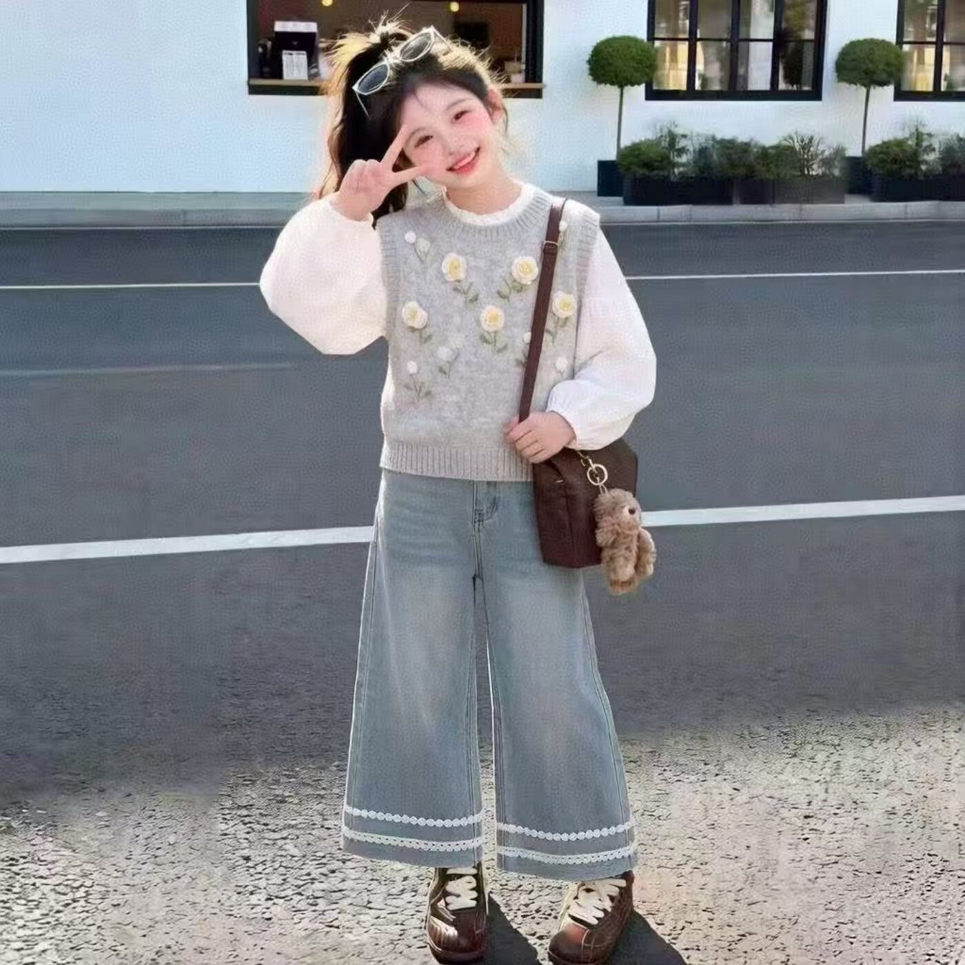 韩系甜美立体花朵毛衣马甲背心叠穿衬衫套装女童春秋牛仔裤三件套