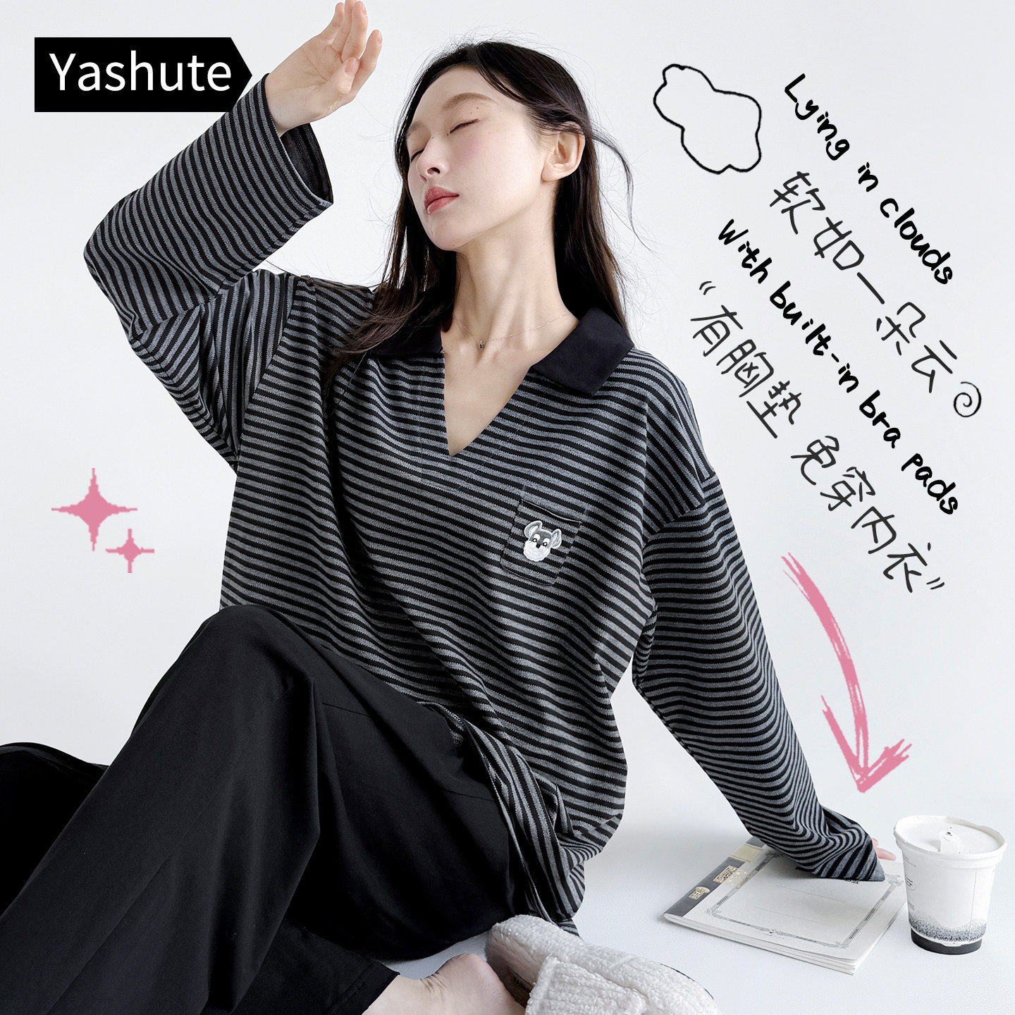 带胸垫一体睡衣女款春秋季秋款长袖纯棉家居服条纹卡通可外穿套装