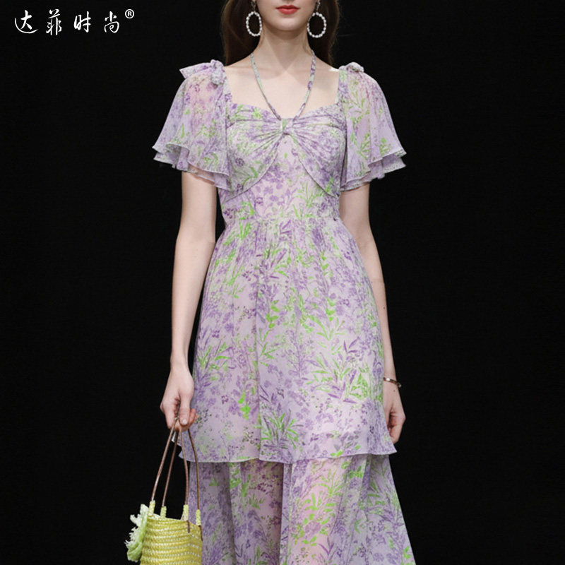 2026夏装新款时尚气质荷叶袖收腰抽褶荷叶边印花雪纺气质连衣裙