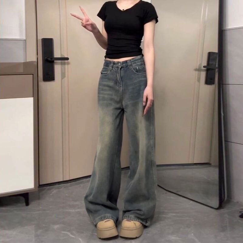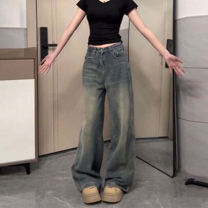 蓝色巨好看的牛仔裤女款春秋季大码梨形身材胖mm显瘦高腰阔腿裤子