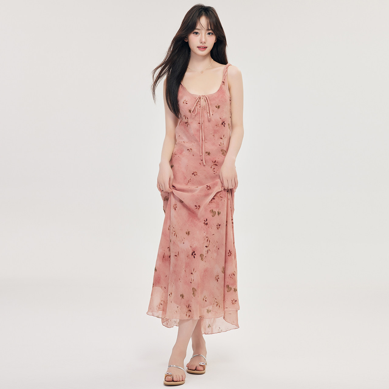 尔给修身粉色碎花吊带裙2024新款女夏季法式高级感收腰长款连衣裙
